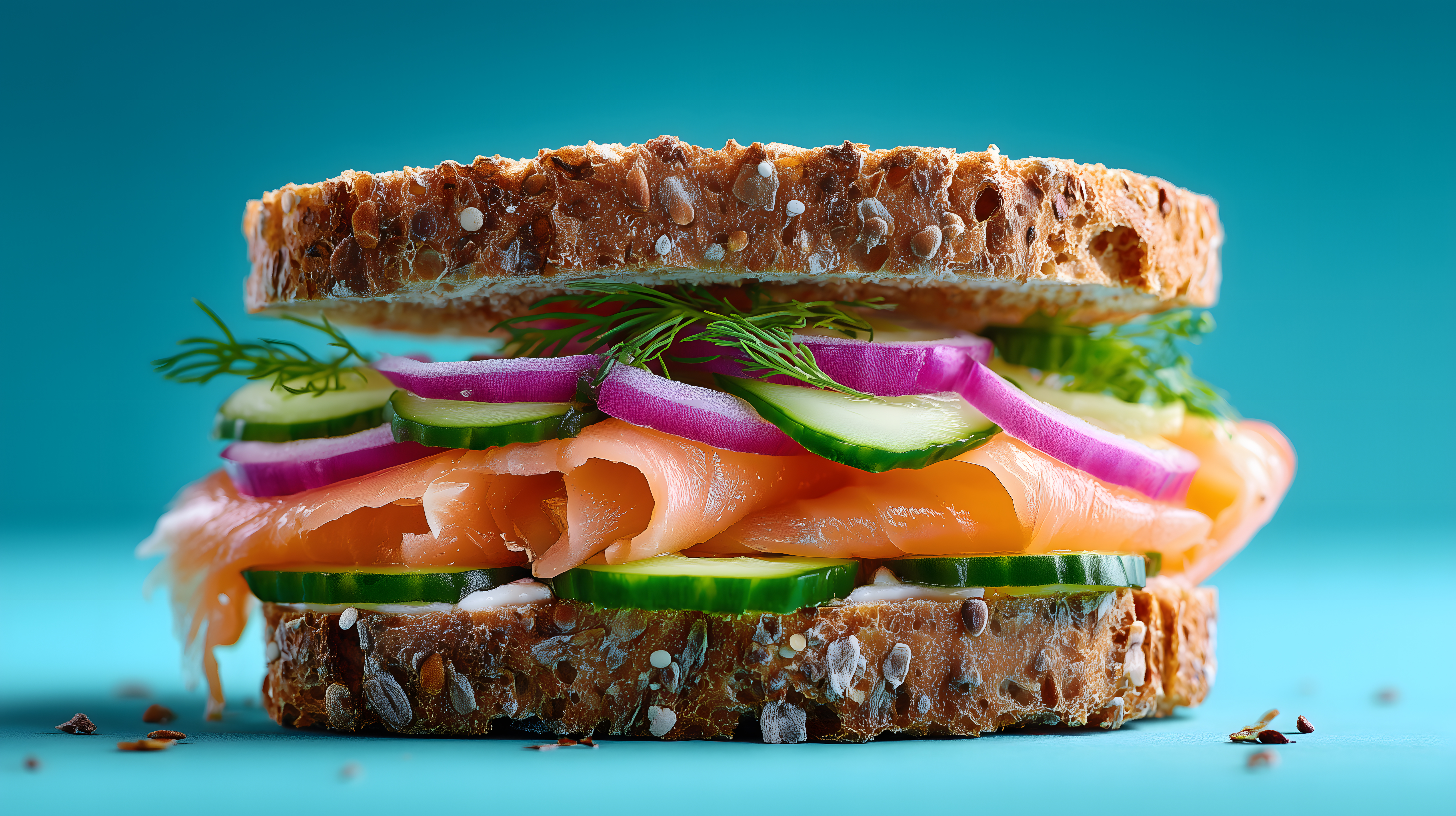 Dieses appetitliche Sandwich aus knusprigem Vollkornbrot, zartem Lachsfilet, frischen Gurkenscheiben, roten Zwiebeln und kräftigem Dill ist ein sättigendes und zugleich gesundes Gericht. Die Zutaten sind ansprechend angerichtet und kontrastieren farblich perfekt mit dem türkisfarbenen Hintergrund. Dieses hochwertige Stockfoto eignet sich hervorragend für Blogs, Newsletter, Social-Media-Beiträge oder Werbematerialien rund um das Thema Ernährung, Gesundheit oder Kulinarik. Das Bild ist in hoher Auflösung verfügbar und unter einer Creative-Commons-Lizenz nutzbar.