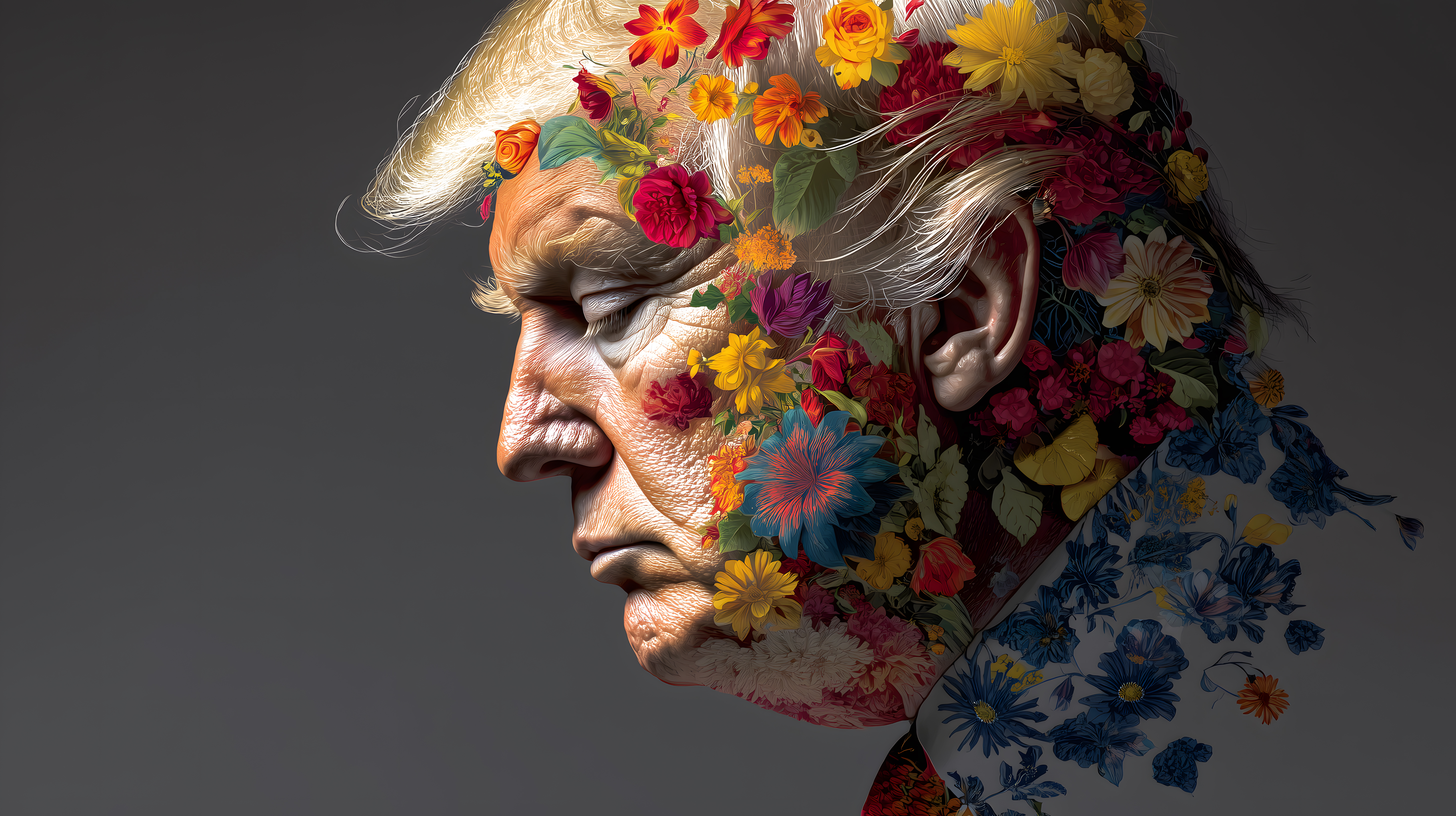 Das Bild zeigt ein Porträt eines älteren Mannes, dessen Gesicht künstlerisch mit bunten Blumen und Blättern gestaltet wurde. Die Blumen scheinen aus dem Gesicht zu wachsen und es wie eine Maske zu bedecken. Der Kontrast zwischen dem markanten Gesichtsprofil und den farbenfrohen, floralen Elementen erzeugt einen faszinierenden, surrealen Eindruck. Diese digitale Illustration bietet sich ideal als hochwertiges Stockfoto für kreative Projekte in Bereichen wie Werbung, Grafikdesign oder Zeitungsartikel an. Das kostenfrei verfügbare Bild in hoher Auflösung steht unter einer Creative-Commons-Lizenz zur Verfügung.