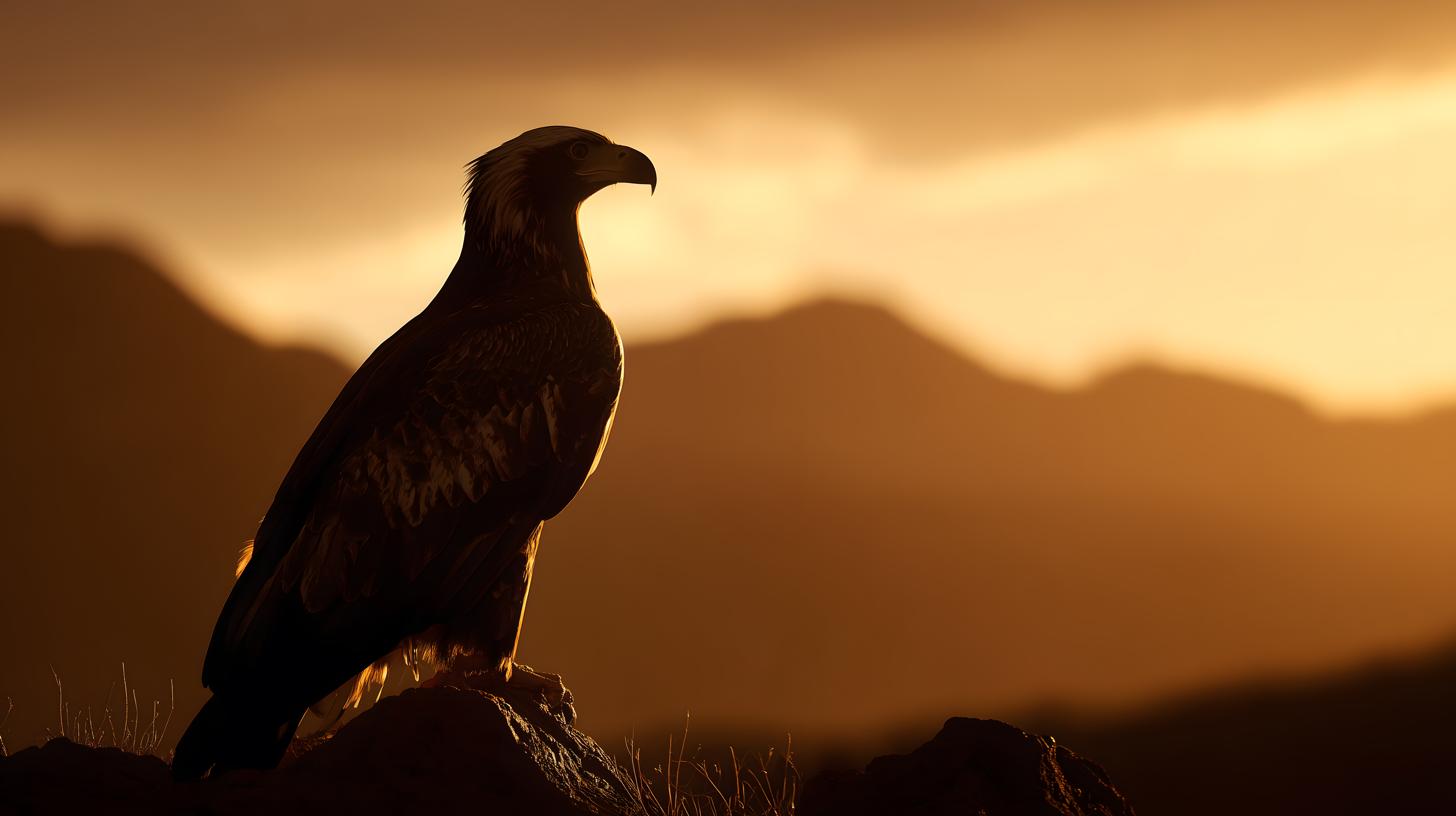 Dieses beeindruckende Foto zeigt einen majestätischen Adler in Silhouette vor einer atemberaubenden Berglandschaft bei Sonnenuntergang. Die warmen, orangefarbenen Töne des Abendhimmels verleihen dem Bild eine romantische Stimmung und betonen die Größe und Erhabenheit des Raubvogels. Die Komposition mit dem Adler auf einem Felsen in der Mitte lenkt den Blick gezielt auf das Hauptmotiv und die Bergkette im Hintergrund. Dieses hochauflösende Stockfoto eignet sich hervorragend für den Einsatz in Blogs, Newslettern, Social-Media-Beiträgen oder Werbekampagnen, die eine natürliche, wilde Ästhetik vermitteln möchten. Es steht unter einer Creative-Commons-Lizenz kostenfrei zur Verfügung.