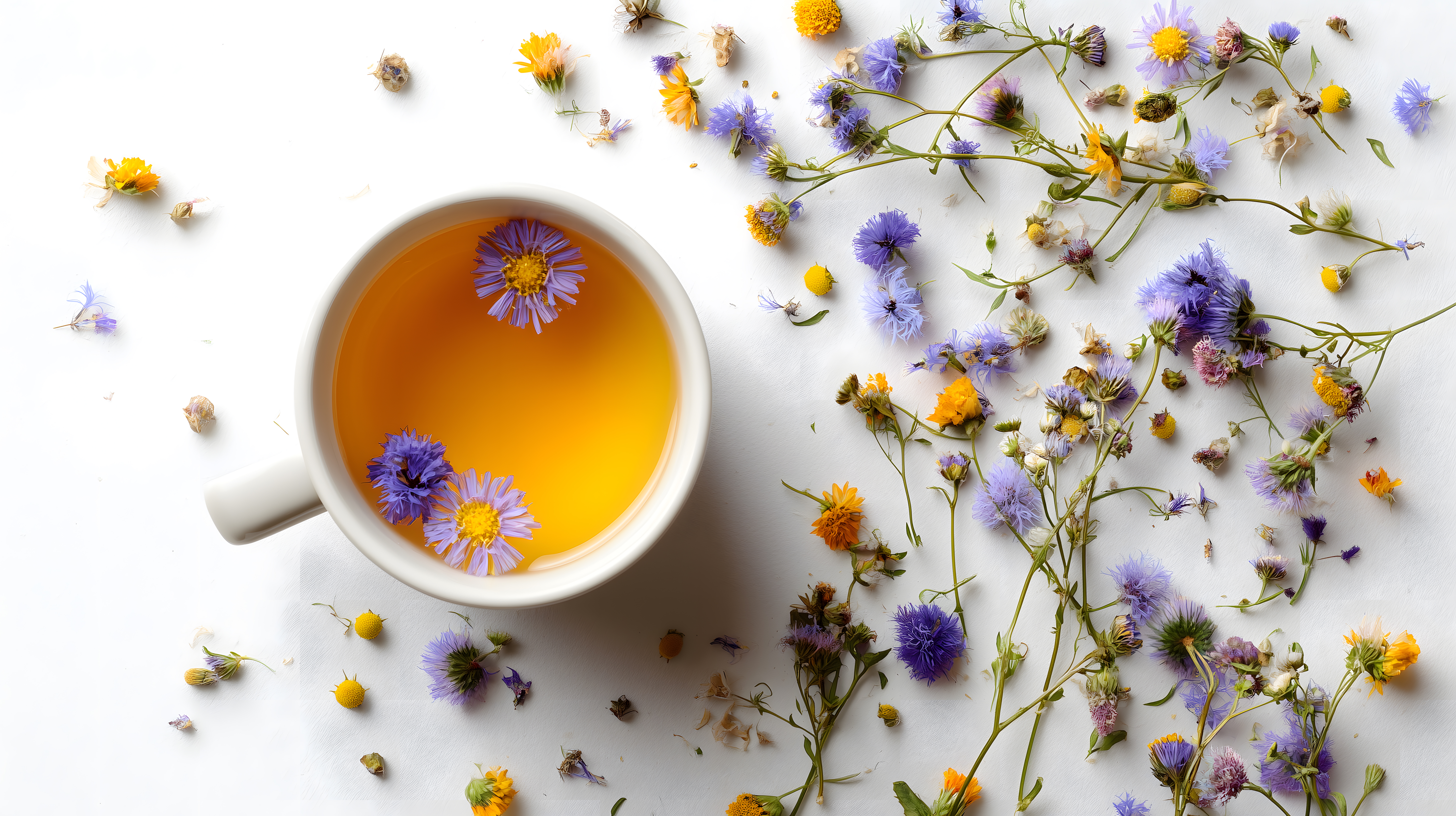 Dieses wunderschöne Foto zeigt einen Kräutertee, umgeben von bunten Wildblumen auf einem weißen Hintergrund. Die Komposition ist perfekt ausgewogen, mit den gelben, lila und blauen Blüten, die den Tee sanft umrahmen. Das Bild strahlt eine Atmosphäre der Ruhe und Entspannung aus und wäre ideal für den Einsatz in Blogbeiträgen, Newslettern, Social-Media-Posts oder Werbekampagnen zum Thema Wellness, Gesundheit oder Naturkosmetik. Als kostenloses Stockfoto in hoher Auflösung und unter Creative-Commons-Lizenz ist es für eine Vielzahl von Projekten geeignet.