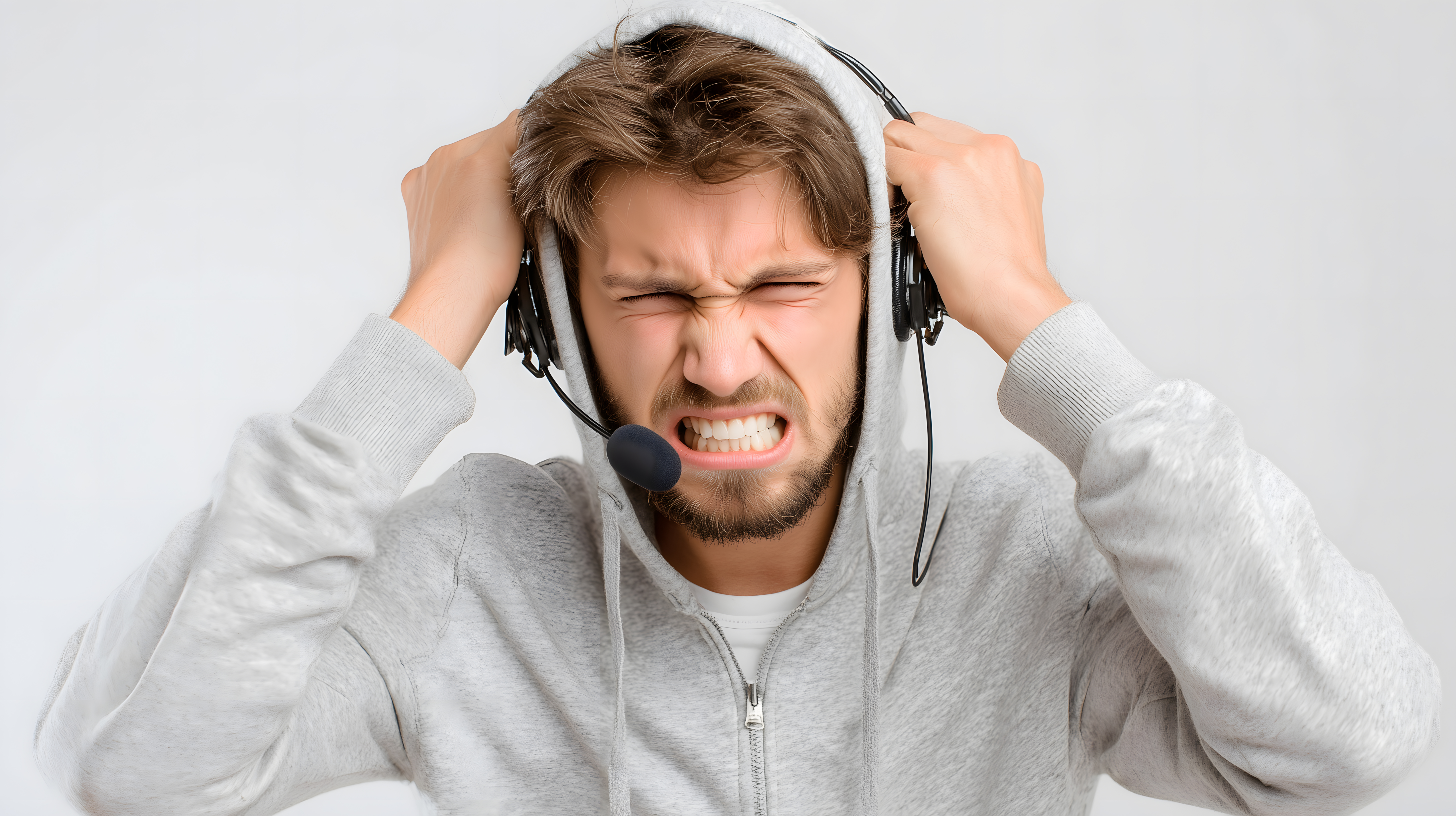 Das Bild zeigt einen jungen Mann mit Bart, der einen grauen Hoodie trägt und frustriert aussieht, während er Kopfhörer aufhat. Der Ausdruck auf seinem Gesicht lässt erkennen, dass er gestresst oder gestört ist. Das Foto hat einen einfachen weißen Hintergrund, wodurch der Fokus ganz auf den Ausdruck und die Körpersprache des Mannes liegt.