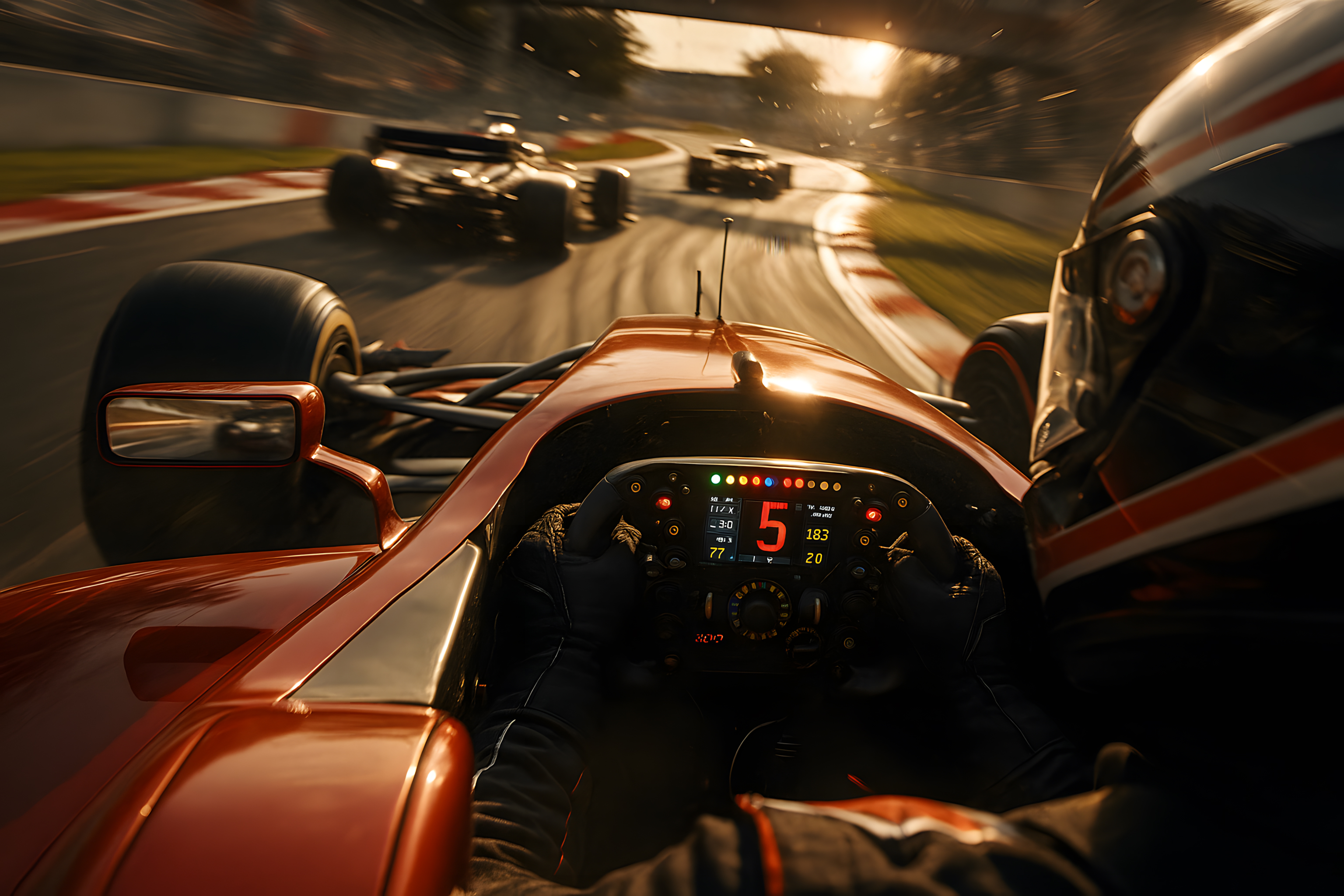 Dieses faszinierende Bild zeigt die dramatische Perspektive aus dem Cockpit eines Formel-1-Rennwagens während eines rasanten Rennens. Der Betrachter wird mitten in die Aktion versetzt und kann die Geschwindigkeit, Spannung und Faszination des Motorsports förmlich spüren. Das schemenhaft vorbeirasende Heck des vorderen Rennwagens, die blinkenden Anzeigen und Kontrollleuchten sowie die leicht unscharfe Darstellung der Kurve vermitteln das Gefühl, sich selbst in der Fahrerposition zu befinden. Das Bild eignet sich hervorragend für die Verwendung in Artikeln, Blogbeiträgen oder Social-Media-Posts rund um den Motorsport, Technik und Action. Als hochwertiges, kostenloses Stockfoto unter der Creative-Commons-Lizenz kann es vielfältig eingesetzt werden.