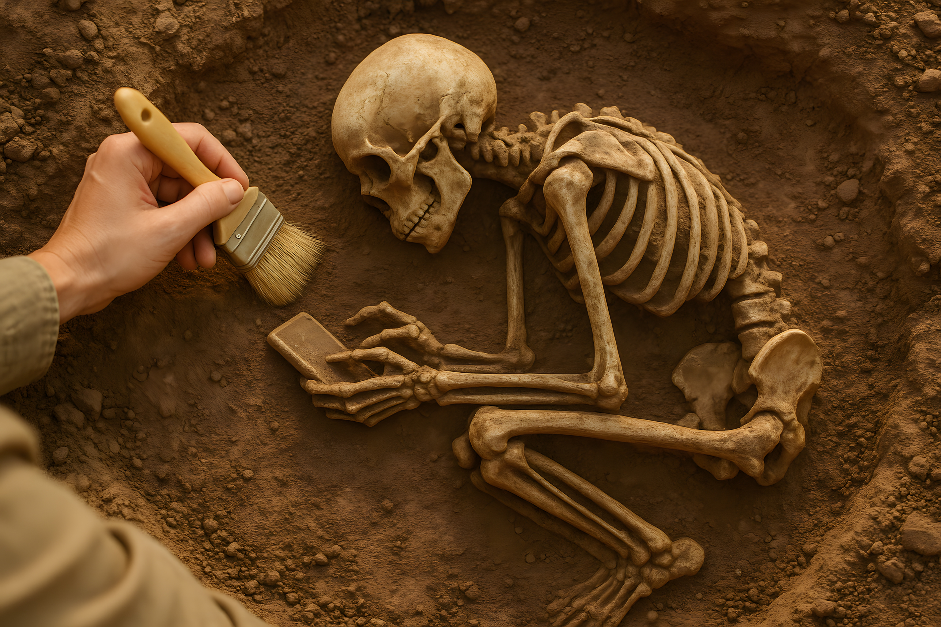 Dieses hochauflösende Foto zeigt einen Archäologen bei der Untersuchung eines Skelett-Fundstücks auf einer Ausgrabung. Im Vordergrund ist eine detaillierte Aufnahme des teilweise freigelegten Skeletts zu sehen, das vorsichtig mit einem Pinsel von der umgebenden Erde befreit wird. Die Knochen liegen in einem braunen, erdigen Untergrund, der den Eindruck einer archäologischen Grabungsstätte vermittelt. Dieses freie Stockfoto eignet sich hervorragend für den Einsatz in Blogs, Newslettern oder Social-Media-Beiträgen rund um die Themen Archäologie, Paläontologie, Wissenschaft und Geschichte. Es steht in hoher Auflösung unter der Creative-Commons-Lizenz zur Verfügung.