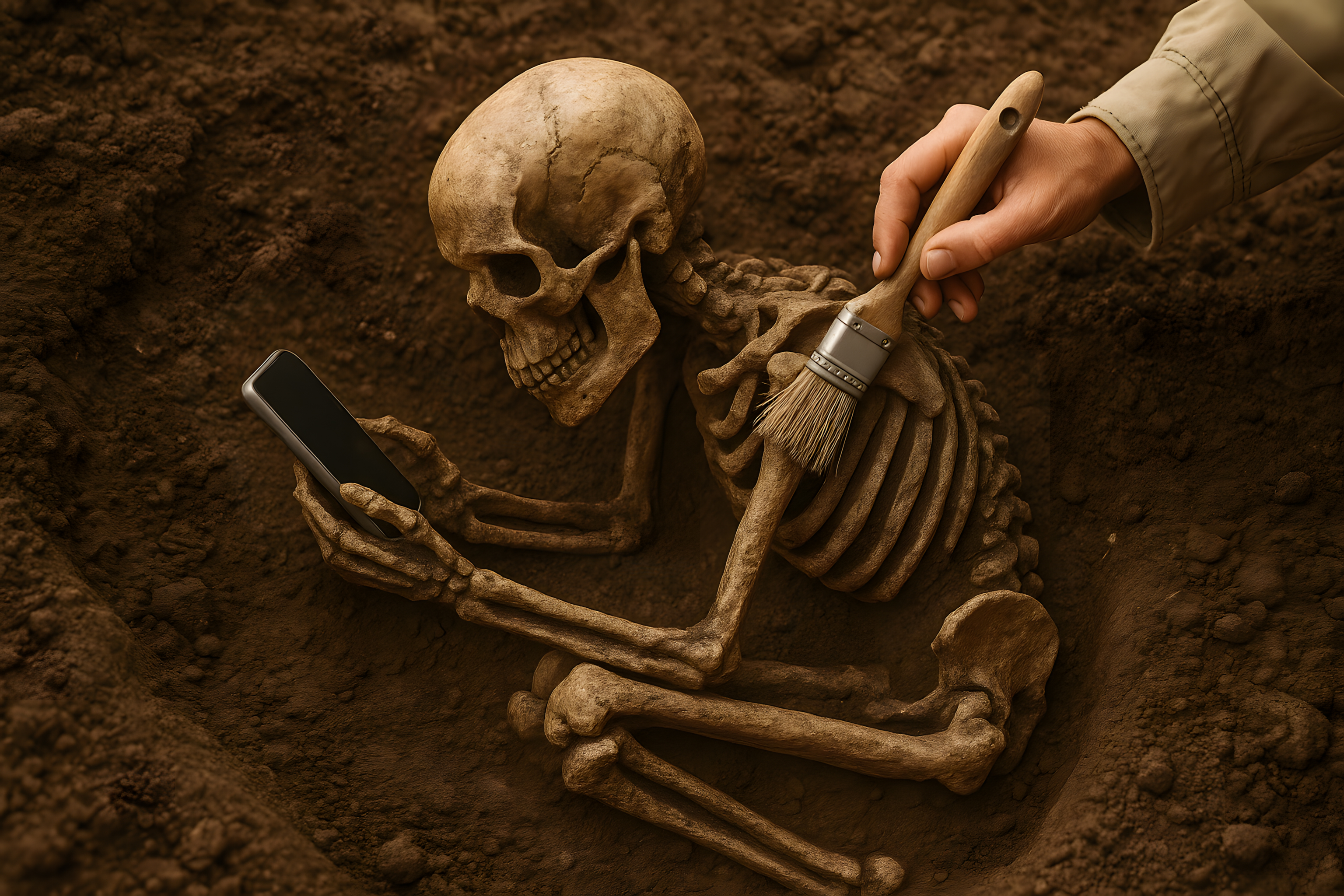 Dieses Foto zeigt einen Archäologen, der während einer Ausgrabung ein altes Skelett mit seinem Smartphone dokumentiert. Im Vordergrund liegt das menschliche Skelett aus Knochen mit einem deutlich erkennbaren Schädel auf dem erdigen Boden. Der Archäologe hält einen Pinsel in der Hand, vermutlich um vorsichtig den Staub von den Knochen zu entfernen. Mit seinem Smartphone nimmt er das Skelett auf, um es für seine weitere Forschungsarbeit zu dokumentieren.