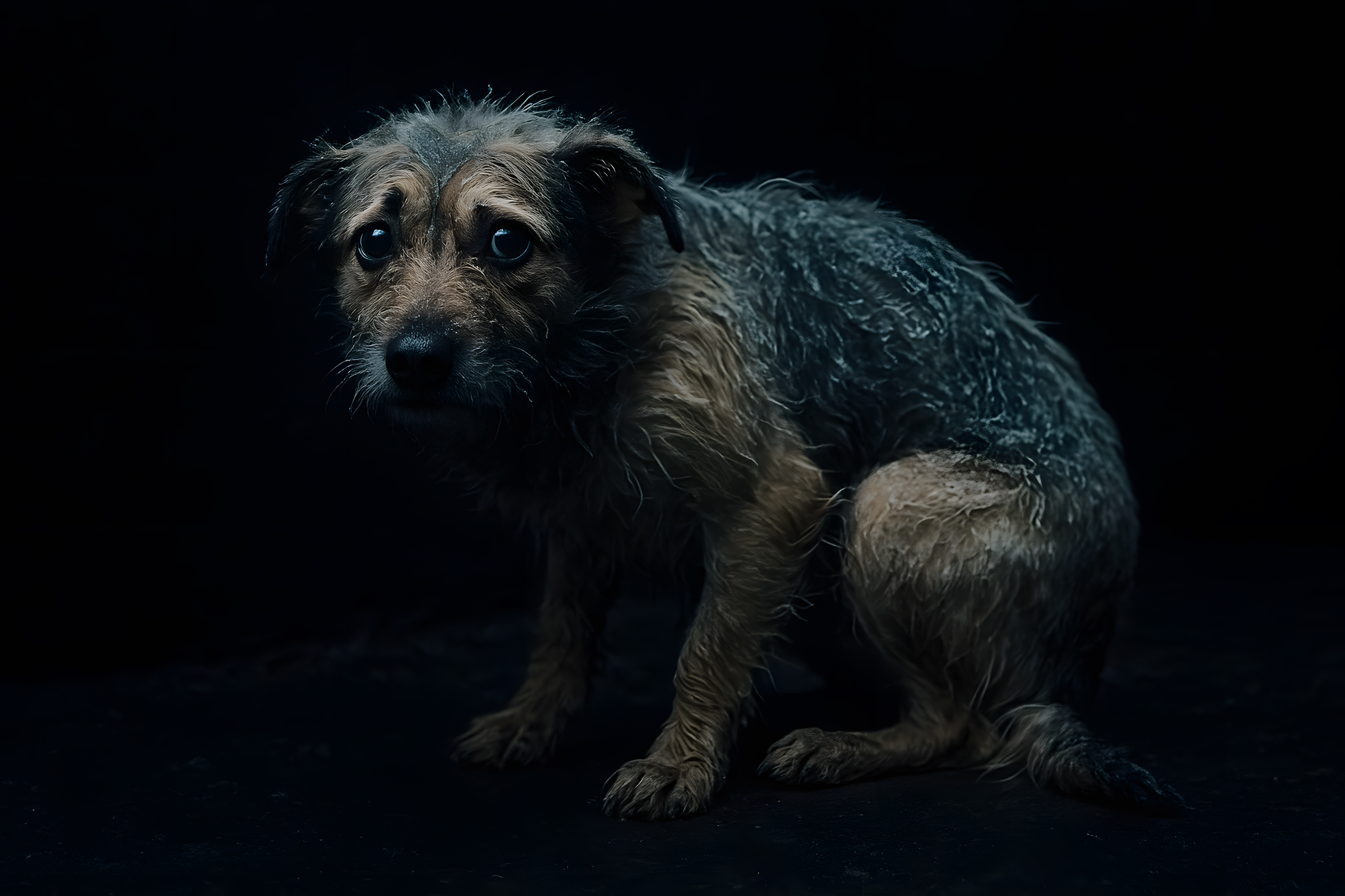 Das Bild zeigt einen ängstlichen, leicht zerzaust aussehenden Hund in einem dunklen Tierheim-Setting. Der Hund sitzt auf dem Boden und blickt mit einem traurigen, verunsicherten Ausdruck in die Kamera. Die düstere, kontrastreiche Beleuchtung und schwarze Umgebung verstärken den Eindruck von Einsamkeit und Hoffnungslosigkeit, den der Hund ausstrahlt.