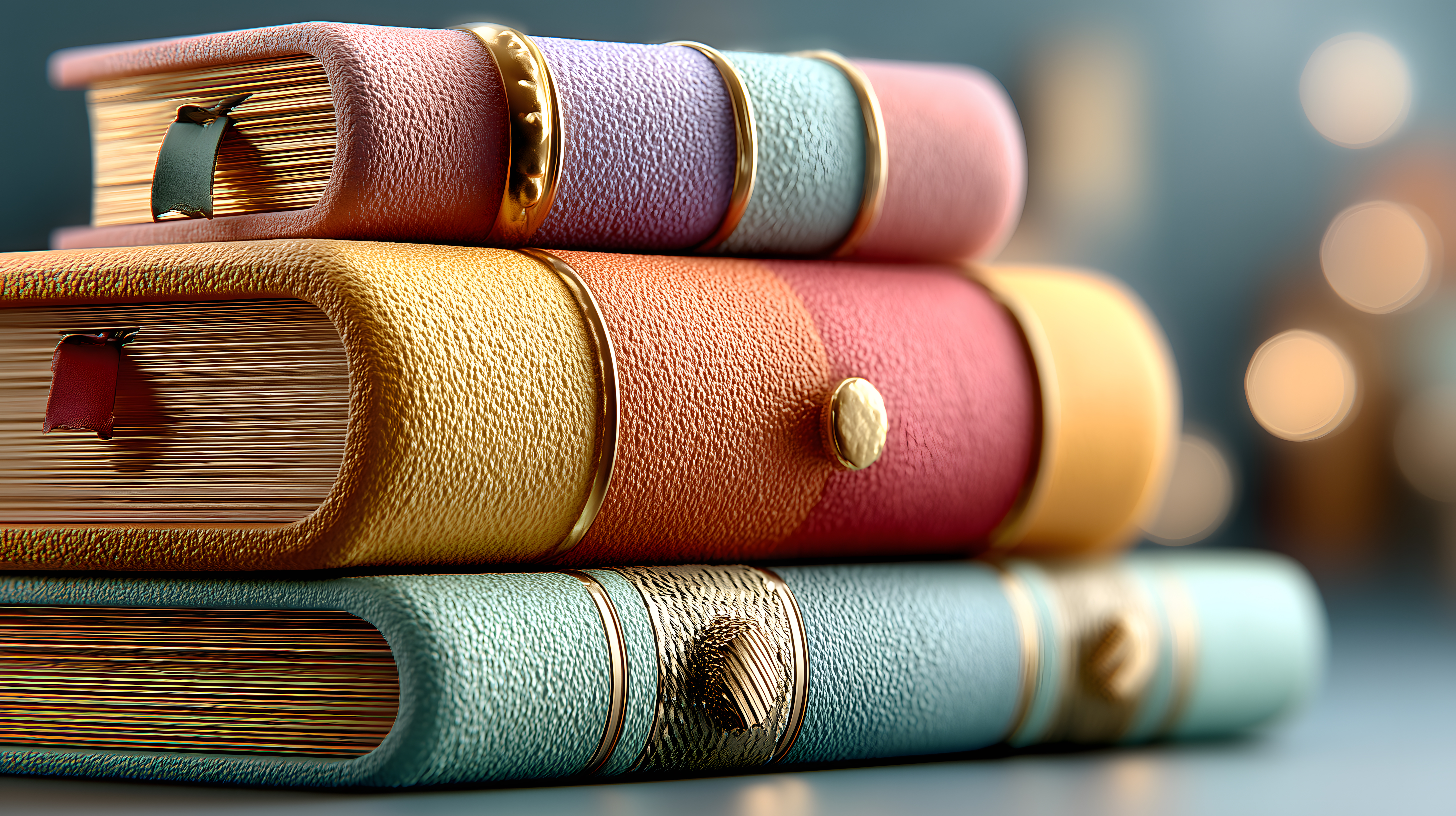 Dieses Stockfoto zeigt einen Stapel bunter Bücher mit goldenen Akzenten auf einem unscharfen Hintergrund. Die Bücher haben unterschiedlich farbige Einbände in Tönen von Rot, Orange, Grün und Blau, die mit goldenen Bändern und Ornamenten verziert sind. Die Komposition und das Spiel mit Farben und Materialien verleihen dem Arrangement eine elegante und hochwertige Ausstrahlung. Dieses Bild eignet sich perfekt als Hintergrundfoto für Blogbeiträge, Newsletter oder Social-Media-Posts zu den Themen Bücher, Literatur, Verlagsbranche oder Produktpräsentation. Das hochauflösende und kostenlose Stockfoto unter Creative-Commons-Lizenz kann vielseitig eingesetzt werden.