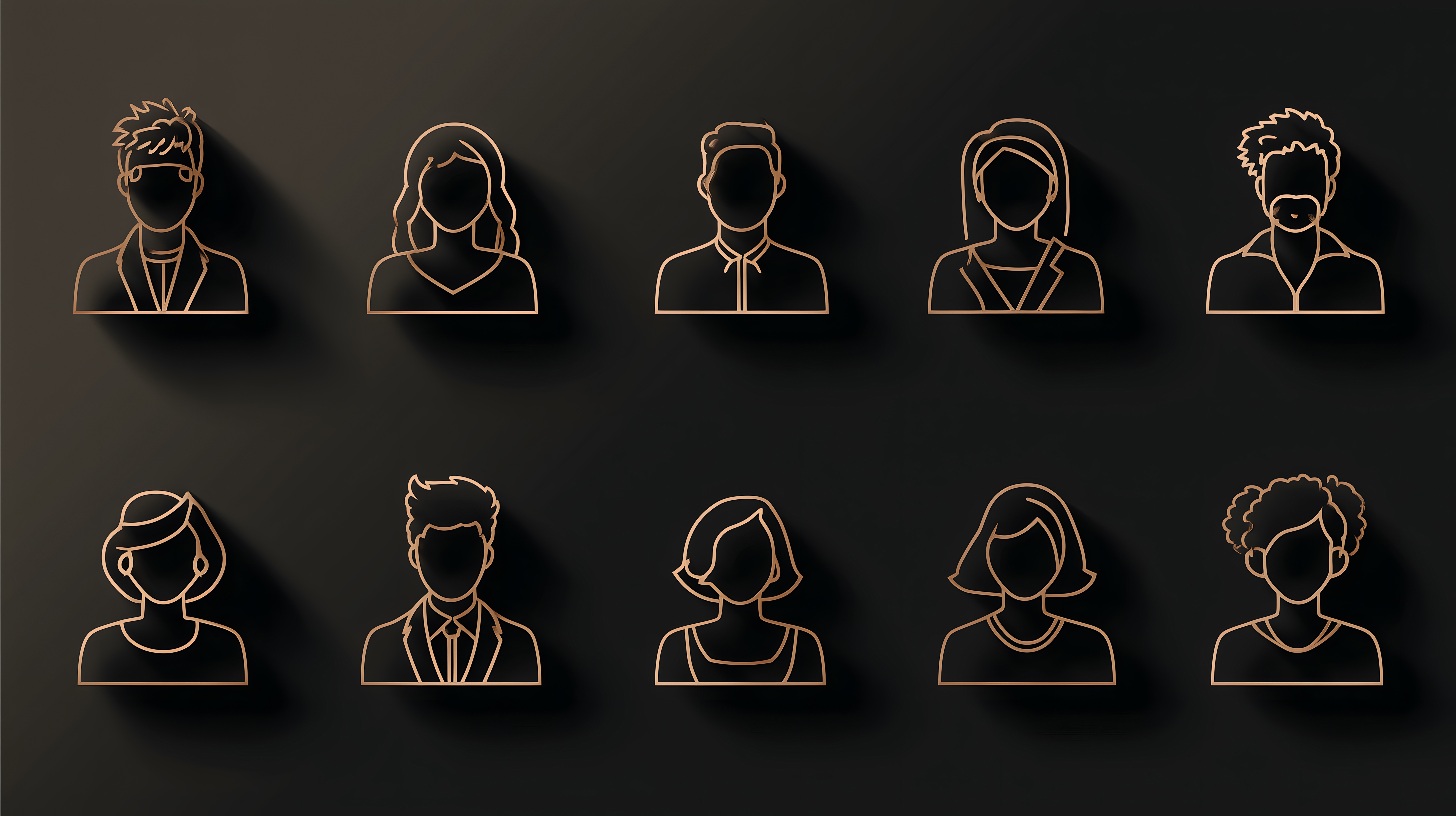 Dieses Stockfoto zeigt eine Reihe stilisierter Nutzer-Avatare, die als minimalistisch gehaltene Linienzeichnungen in eleganter Goldoptik dargestellt sind. Die reduzierten, grafischen Piktogramme vermitteln auf moderne Art und Weise die Idee digitaler Identitäten und persönlicher Darstellung. Das Motiv eignet sich hervorragend für den Einsatz in Webdesign, Social-Media-Postings oder Geschäftsunternehmungen und verleiht ihnen einen hochwertigen, ästhetischen Look. Als kostenloses Stockfoto in hochauflösender Qualität und unter Creative-Commons-Lizenz steht es für vielfältige Einsatzmöglichkeiten zur Verfügung.
