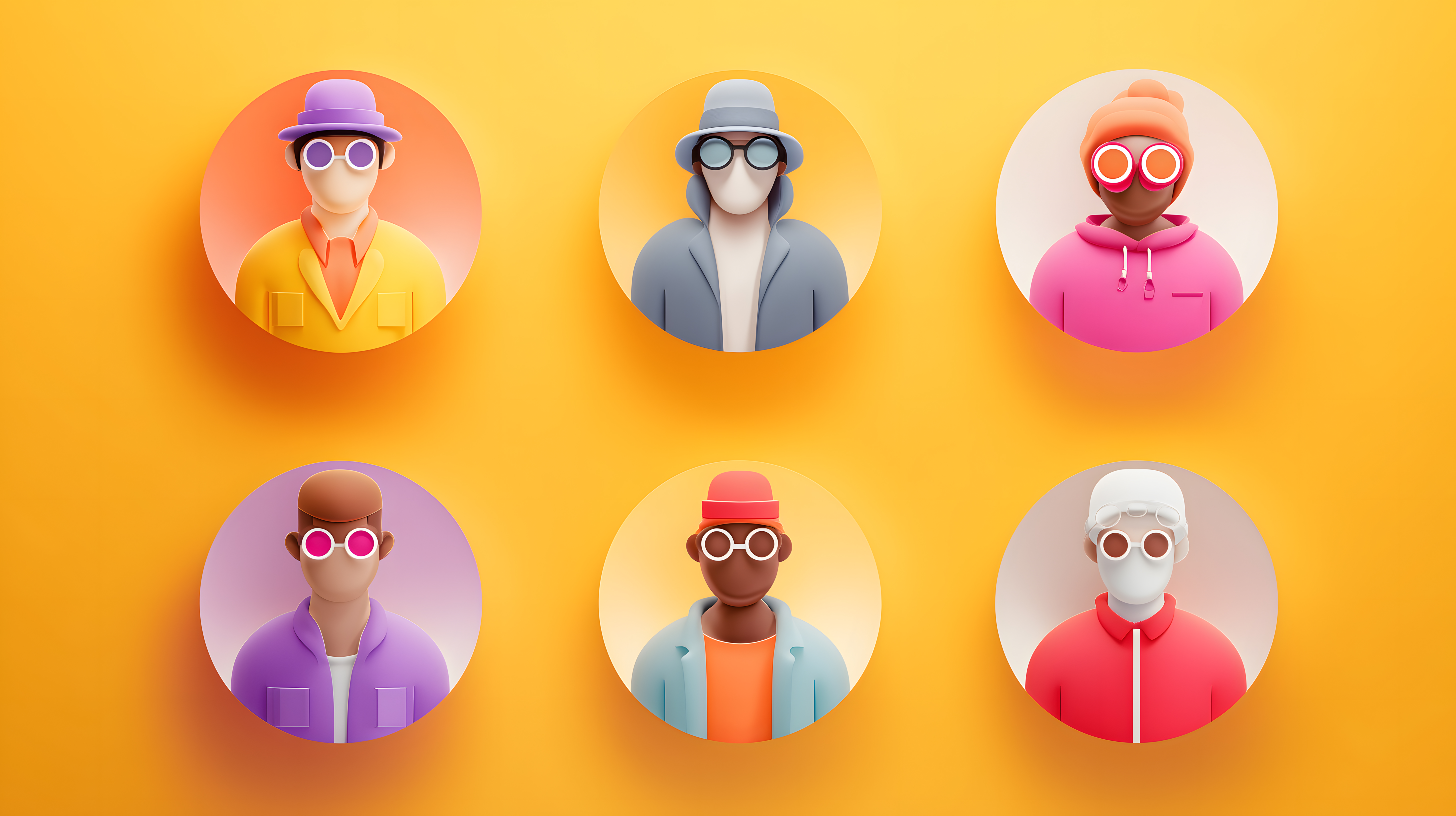 Dieses Stockfoto zeigt eine Reihe moderner, bunter 3D-Avatare, die mit unterschiedlichen stylischen Brillen und Kleidung dargestellt sind. Die Charaktere haben einen abstrakten, illustrativen Look und sind vor einem einfarbig gelben Hintergrund platziert, der den Fokus auf die farbenfrohen Figuren lenkt. Dieses Bild eignet sich hervorragend für den Einsatz in Grafik-Design-Projekten, Werbematerialien, Blogbeiträgen oder Social-Media-Posts, die eine moderne, kreative und vielfältige Optik vermitteln möchten. Als kostenloses Stockfoto in hoher Auflösung und unter einer Creative-Commons-Lizenz ist es ideal für eine Vielzahl von Verwendungszwecken.