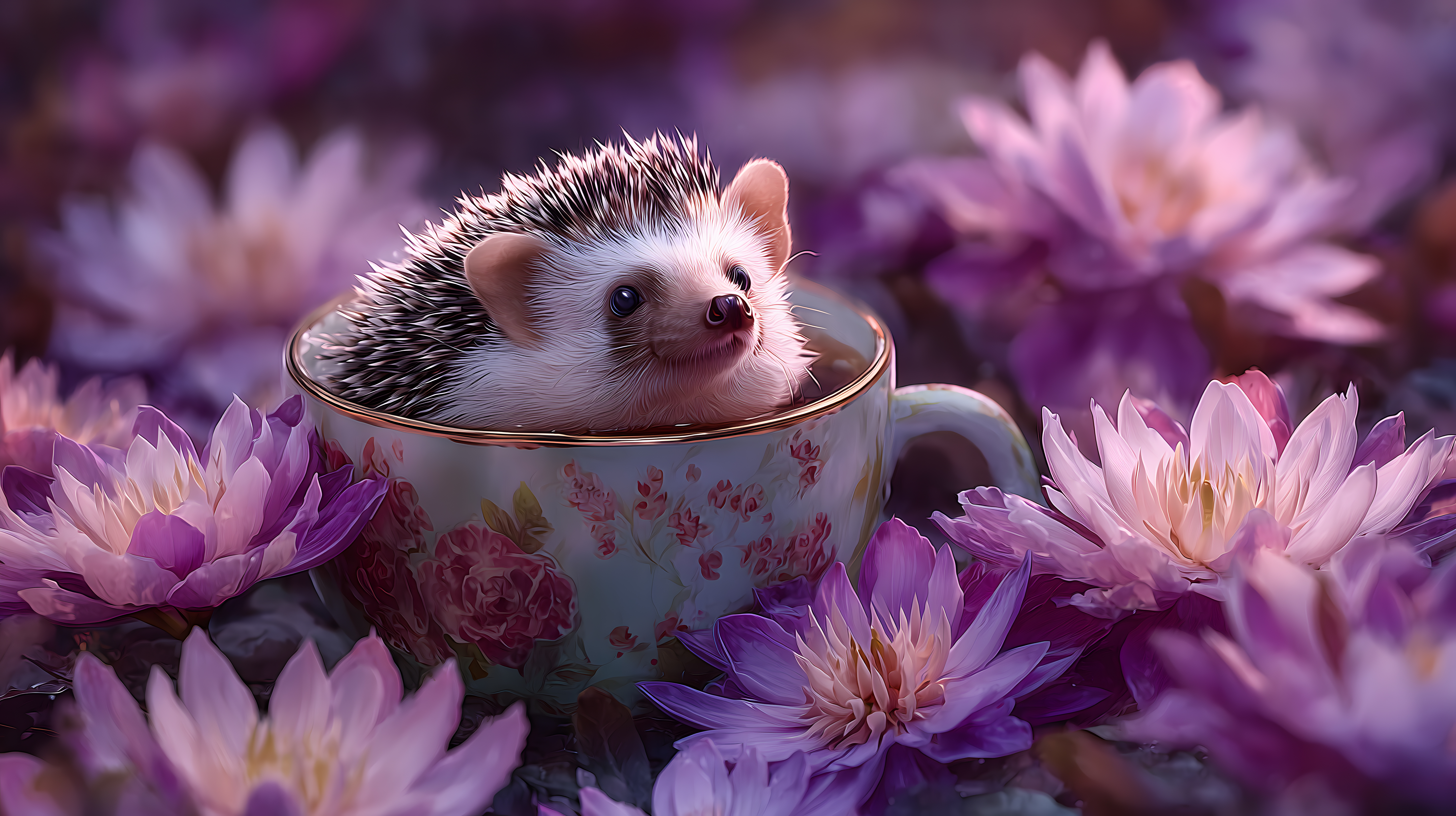 Dieses bezaubernde Foto zeigt einen niedlichen Igel, der in einer vintage-inspirierten Tasse inmitten üppiger lila Dahlien sitzt. Die Blumen umranken die Tasse und verleihen der Szene eine romantische, fast märchenhafte Atmosphäre. Die Komposition ist perfekt ausgewogen, mit dem Igel als Hauptfokus und den farbenfrohen Blüten, die den Betrachter in eine friedvolle, natürliche Welt entführen. Dieses hochauflösende Stockfoto eignet sich hervorragend für Blogs, Newsletter, Social-Media-Beiträge oder Werbeanzeigen, in denen eine stimmungsvolle, naturnahe Ästhetik gefragt ist. Es steht unter Creative-Commons-Lizenz zum kostenlosen Download zur Verfügung.