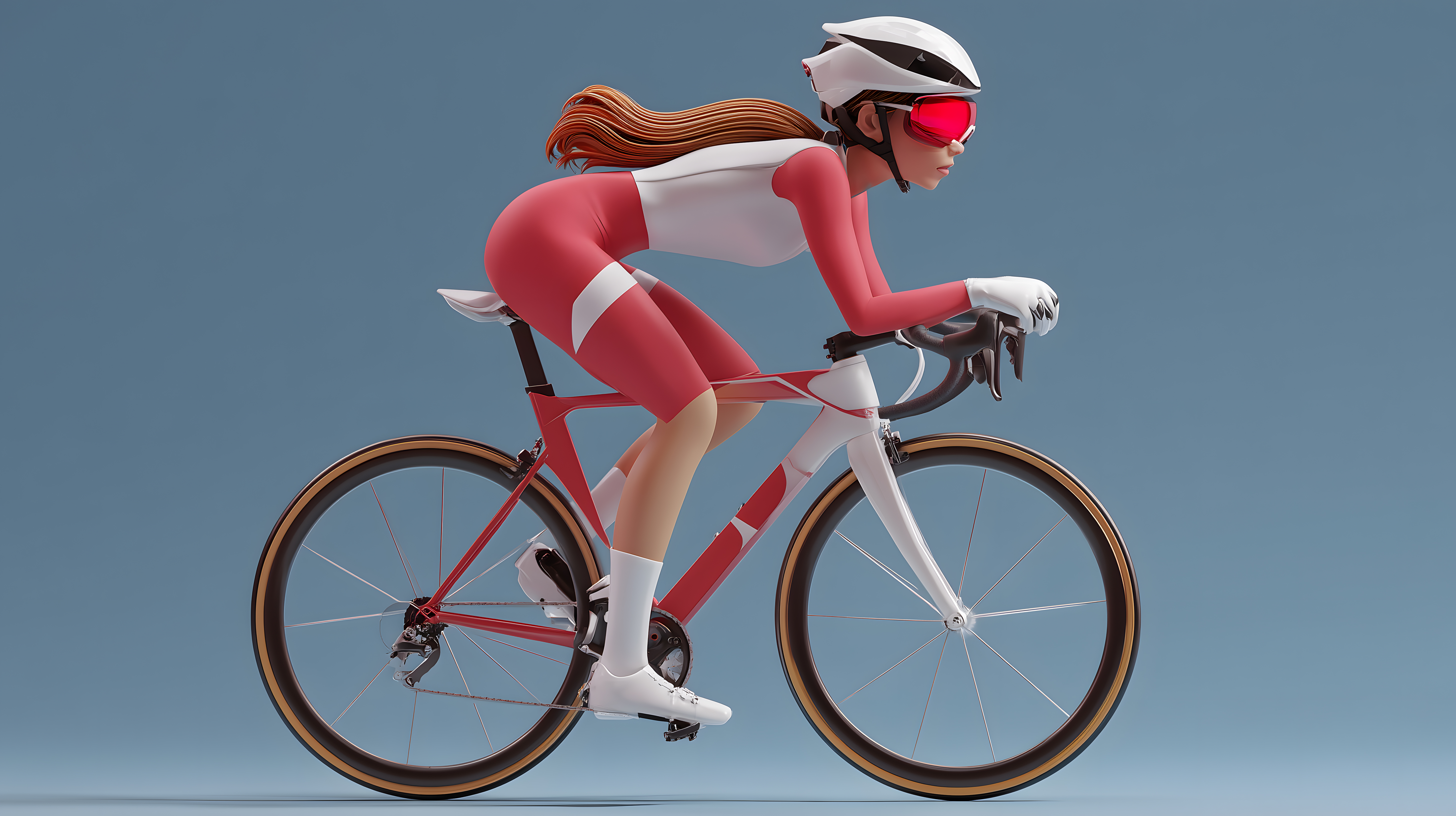 Das Bild zeigt eine 3D-animierte Radfahrerin in einem roten und weißen Rennrad-Outfit, die in dynamischer Fahrt auf ihrem Rennrad zu sehen ist. Die Perspektive ist seitlich, wodurch die Bewegung und Kraft der Athletin besonders gut zu erkennen ist. Die Farbgebung in Rot, Weiß und Blau verleiht dem Bild einen modernen, sportlichen Look.