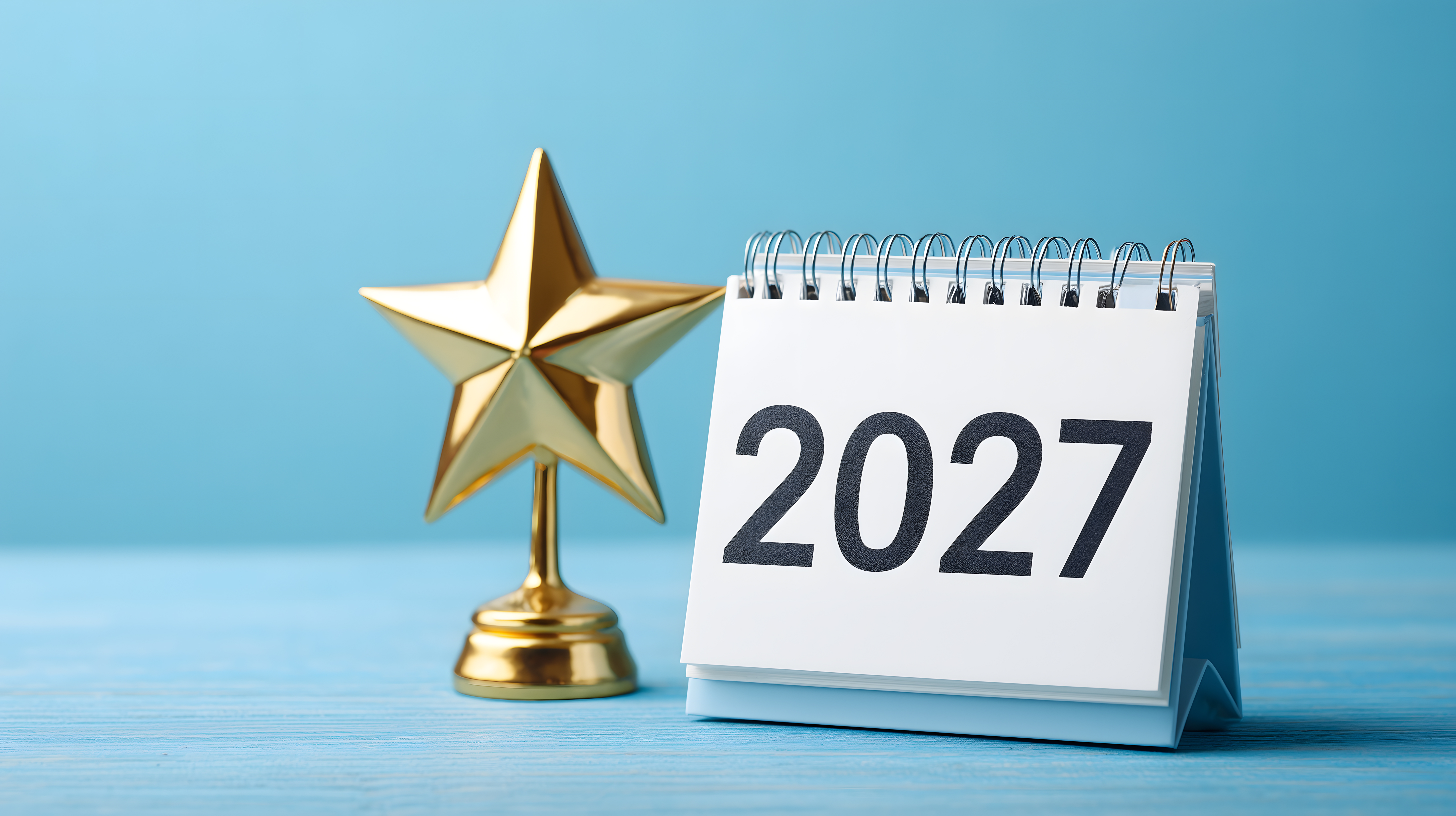 Dieses Bild zeigt einen modernen Tischkalender, der das Jahr 2027 ankündigt. Der Kalender steht neben einem goldenen Stern, der als dekorative Verzierung dient. Die ganze Szenerie ist vor einem einfarbigen, türkisfarbenen Hintergrund platziert, der den Fokus auf die Hauptelemente lenkt. Das Foto hat einen minimalistischen und modernen Stil und eignet sich hervorragend als hochwertiges Stockfoto für verschiedene Anwendungen wie Blogbeiträge, Werbematerial, Social-Media-Posts oder Newsletter rund um das Thema Neujahr, Jahreswechsel und Zukunftsplanung. Das Bild ist in hoher Auflösung verfügbar und steht unter einer kostenlosen Creative-Commons-Lizenz zur Verfügung.