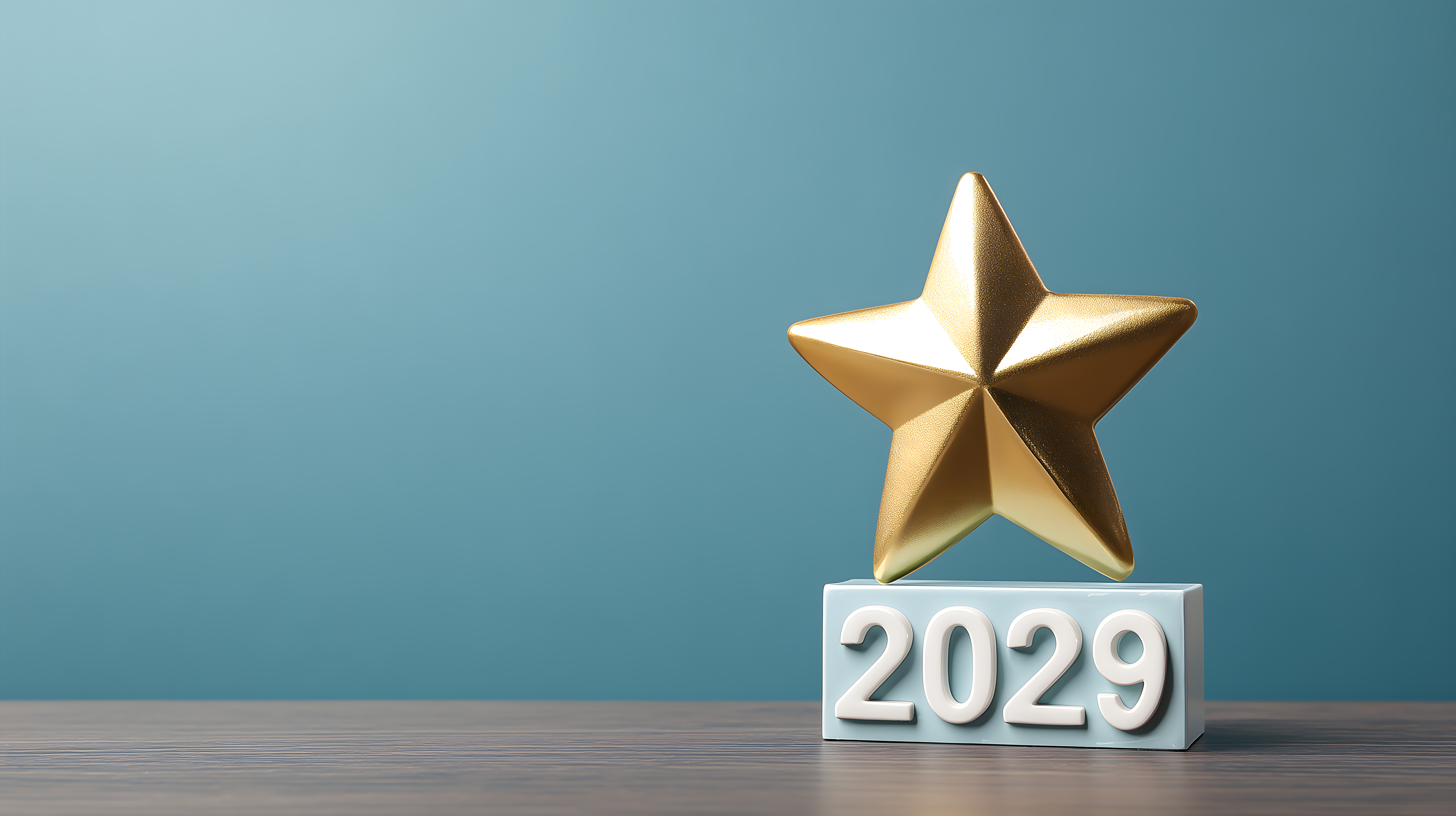 Dieses Bild zeigt einen goldenen Stern auf einem weißen Podest vor einem türkisfarbenen Hintergrund. Der Stern symbolisiert eine Auszeichnung oder Trophäe zum Jahreswechsel 2029. Das minimalistisch gestaltete Bild bietet viel Freiraum für Text oder andere Gestaltungselemente. Es eignet sich hervorragend als Stockfoto für Neujahrskampagnen, Werbematerialien, Blogs oder Social-Media-Beiträge. Das hochauflösende Foto ist unter der Creative-Commons-Lizenz frei nutzbar.