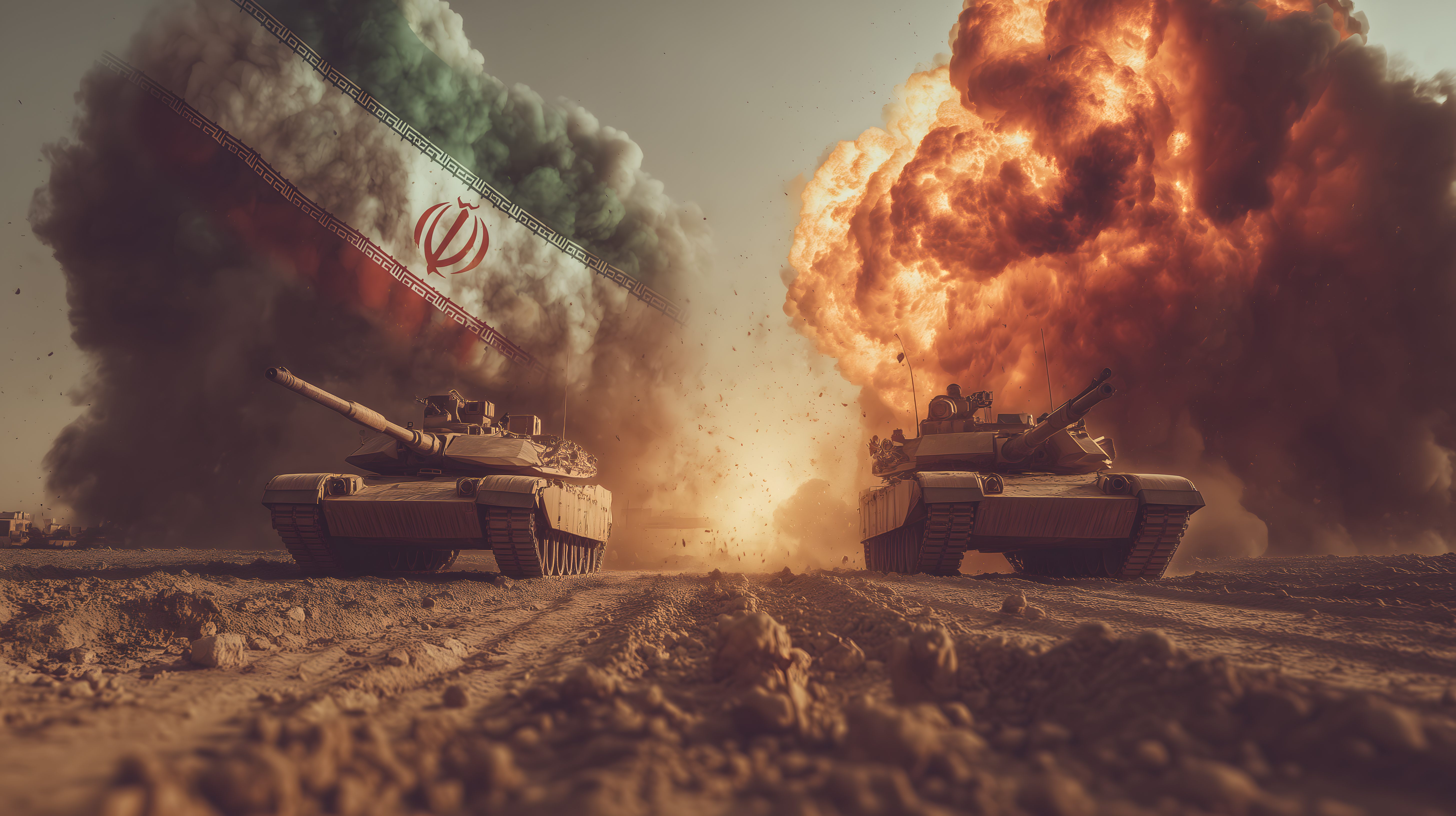 Das Bild zeigt eine dramatische Szene auf einem Schlachtfeld. Zwei Panzer stehen sich feindlich gegenüber, umgeben von gewaltigen Explosionen und dichtem Rauch. Die iranische Flagge weht zwischen den Kampffahrzeugen, was auf den Konflikt zwischen Iran und einem anderen Land hindeutet. Die Perspektive ist bodengebunden, sodass der Betrachter das Geschehen aus der Sicht eines Soldaten miterlebt. Das Bild vermittelt eine bedrohliche und spannungsgeladene Atmosphäre. Es eignet sich für Beiträge zu Themen wie Krieg, Gewalt und Nahostpolitik, aber auch als Hintergrundbild für actionreiche Inhalte. Als kostenloses Stockfoto in hoher Auflösung und unter Creative-Commons-Lizenz kann es vielseitig eingesetzt werden.