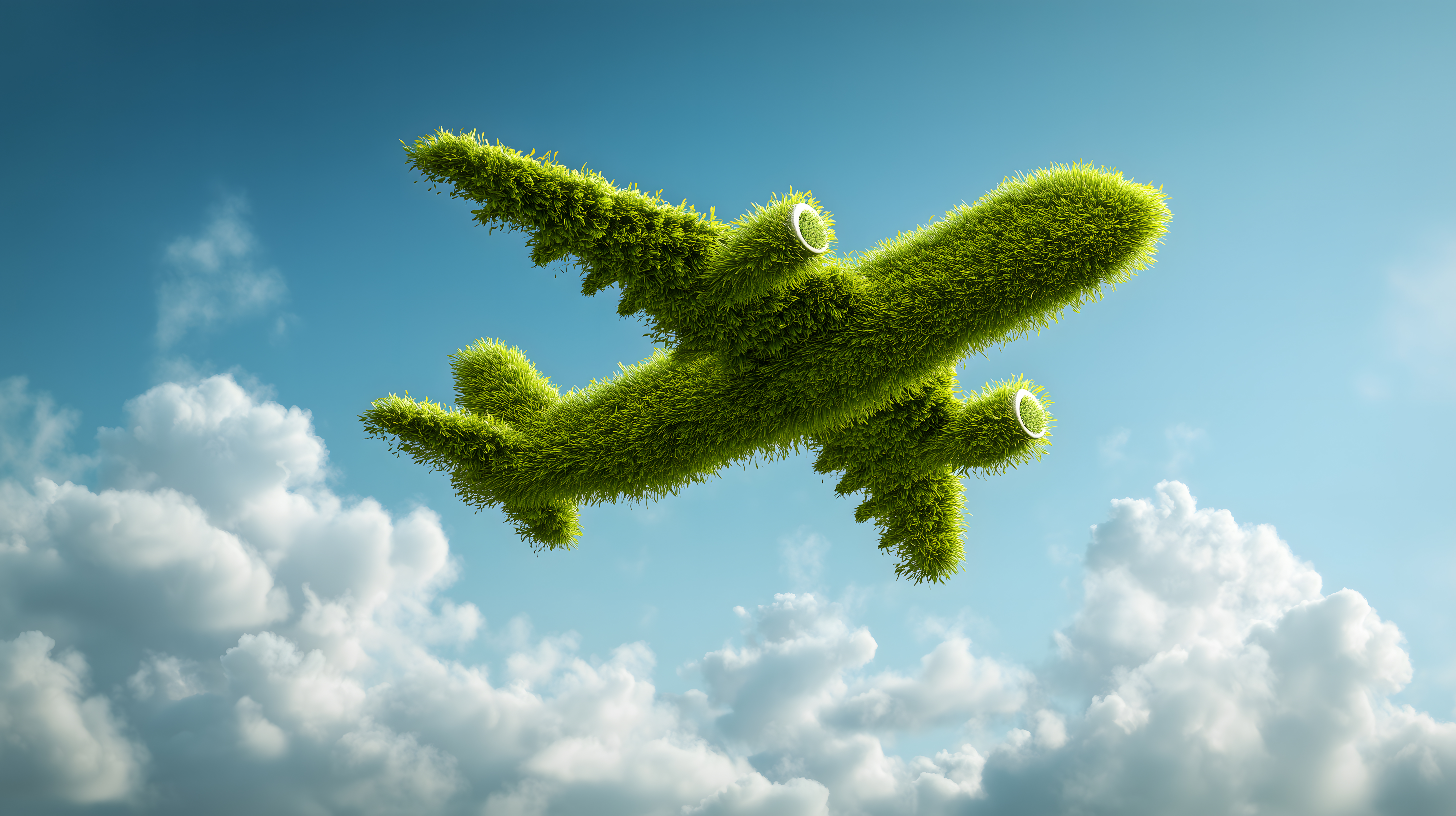 Dieses faszinierende Bild zeigt ein futuristisches Flugzeug, das komplett aus grünem Gras gefertigt ist. Es schwebt vor einem strahlend blauen Himmel mit zarten Wolken, was eine friedliche, nachhaltige Vision der Mobilität der Zukunft vermittelt. Das detailreiche 3D-Rendering präsentiert das Grasflieger-Konzept auf eine fantasievoll-kreative Art, die Raum für Interpretation lässt. Dieses einzigartige Stockfoto ist in hoher Auflösung frei für den Einsatz in Blogs, Newslettern, Social-Media-Posts oder Werbematerialien verfügbar und steht unter einer Creative-Commons-Lizenz.