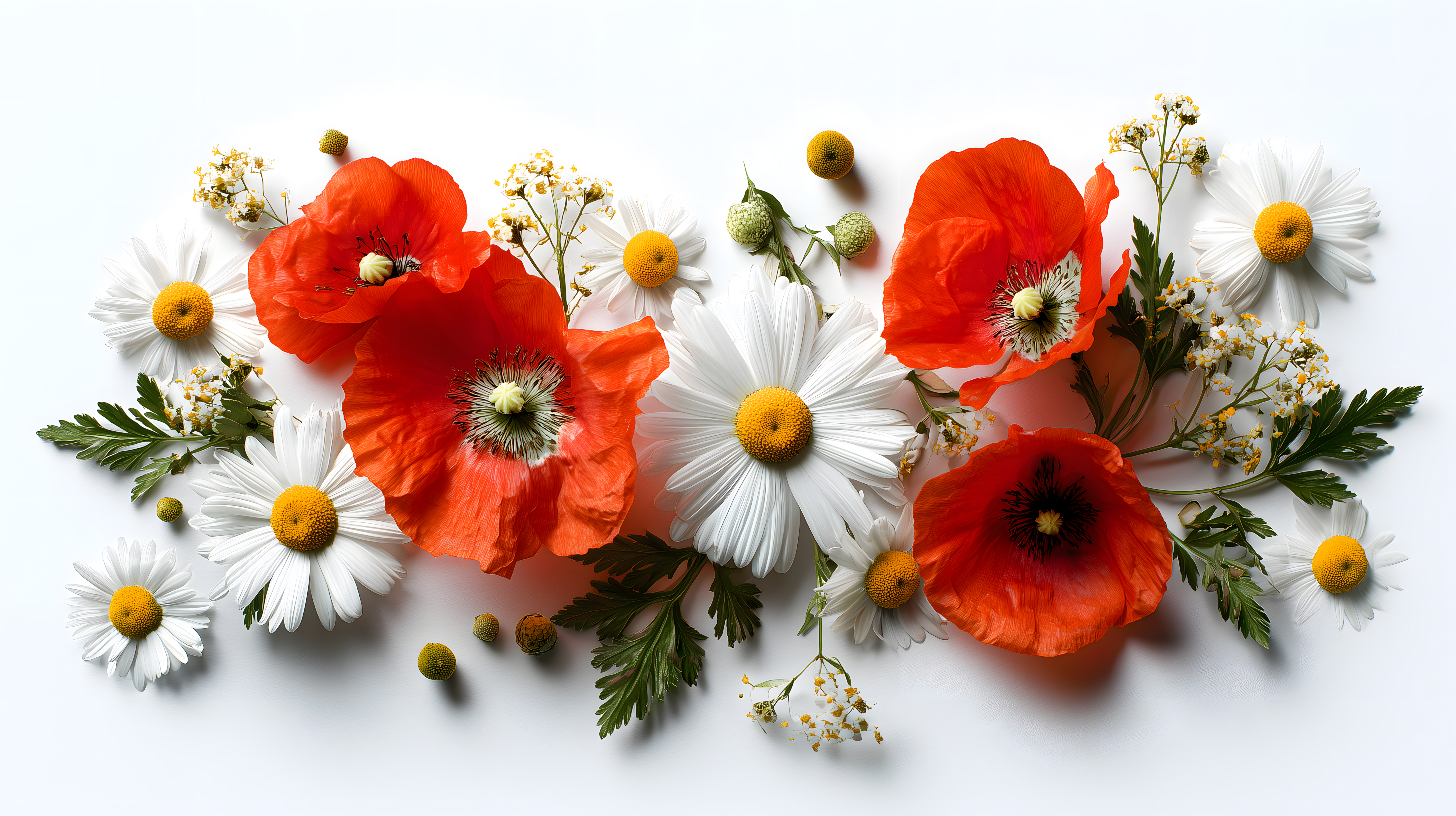 Dieses farbenfrohes Foto zeigt einen liebevoll arrangierten Strauß bunter Sommerblumen. Im Zentrum stechen die leuchtend roten Mohnblüten hervor, umgeben von zarten Gänseblümchen und anderen Wiesenblumen in weißen und gelben Nuancen. Die Komposition ist stimmungsvoll und natürlich, wobei die Blüten vor einem weißen Hintergrund präsentiert werden, um ihre Farbenpracht besonders zur Geltung zu bringen. Dieses Stockfoto eignet sich perfekt für den Einsatz in Blogs, Newslettern, Social-Media-Posts oder als dekorative Ergänzung für Werbemittel und Präsentationen, die einen sommerlichen, natürlichen Charakter vermitteln wollen. Das hochauflösende Bild steht unter einer Creative-Commons-Lizenz kostenlos zum Download zur Verfügung.