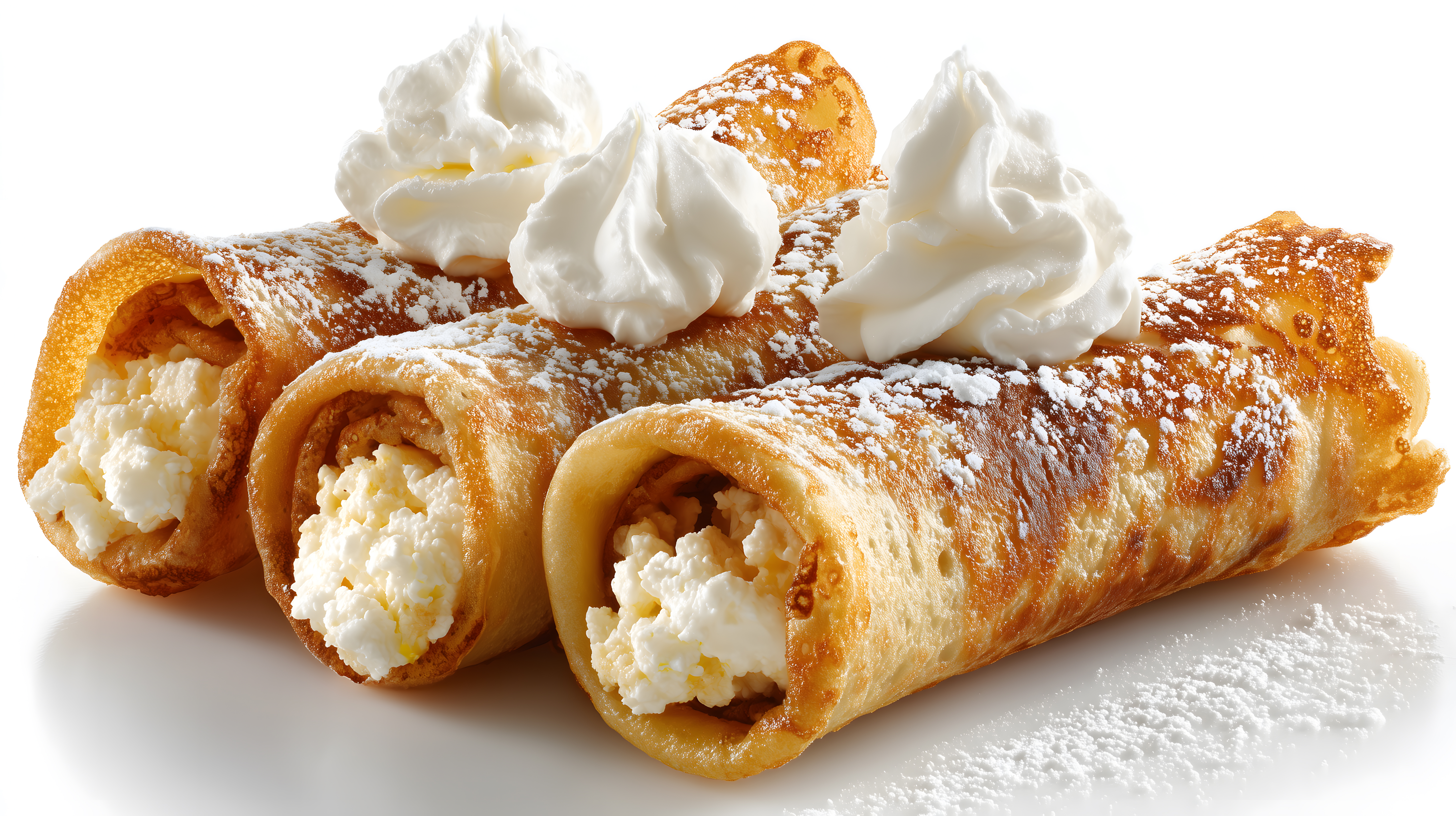 Dieses Bild zeigt eine appetitliche Anordnung von Quarkpfannkuchenrollen, die mit einer cremigen Quarkfüllung gefüllt und mit einer leichten Sahnehaube sowie Puderzucker bestäubt sind. Die goldbraun gebackenen Rollen präsentieren sich auf einem weißen Untergrund, was den Kontrast und die frische Optik des Desserts betont. Diese Aufnahme eignet sich ideal als kostenloses Stockfoto für Blogs, Newsletter, Social-Media-Kanäle oder Werbematerialien rund um Frühstück, Brunch oder Dessertrezepte. Die hochauflösende Datei steht unter einer Creative-Commons-Lizenz zur Verfügung.