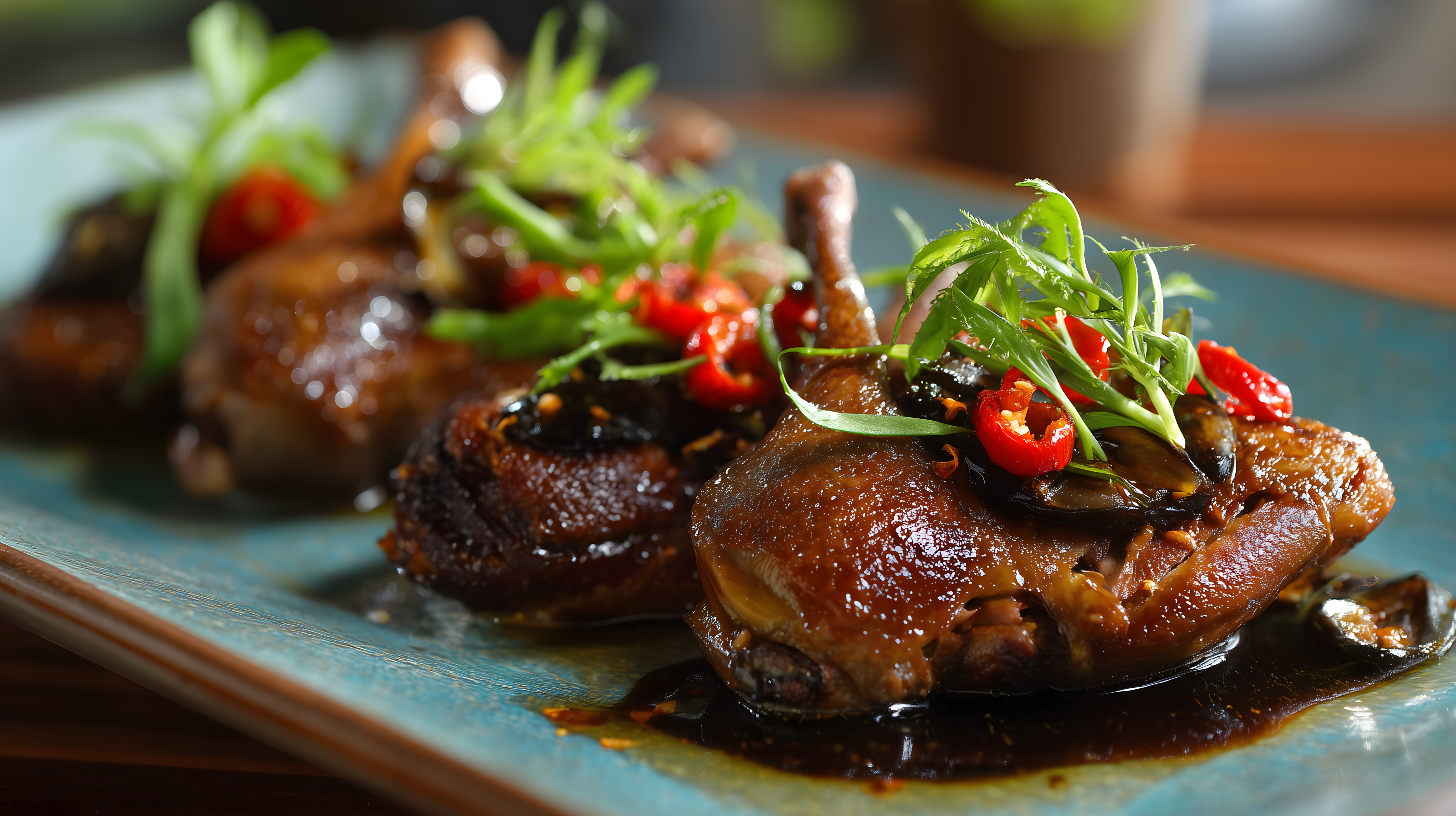 Dieses Foto zeigt ein rustikales Gericht aus gebratenen Wachteln, die mit würzigem Chili-Gemüse garniert sind. Die dunkle Soße und das kräftige Grün der Kräuter bilden einen appetitlichen Kontrast auf dem dunklen Holzteller. Das Bild eignet sich hervorragend für Rezeptblogs, Restaurantwerbung oder kulinarische Social-Media-Beiträge. Als kostenloses Stockfoto in hoher Auflösung und unter Creative-Commons-Lizenz kann es vielseitig eingesetzt werden.