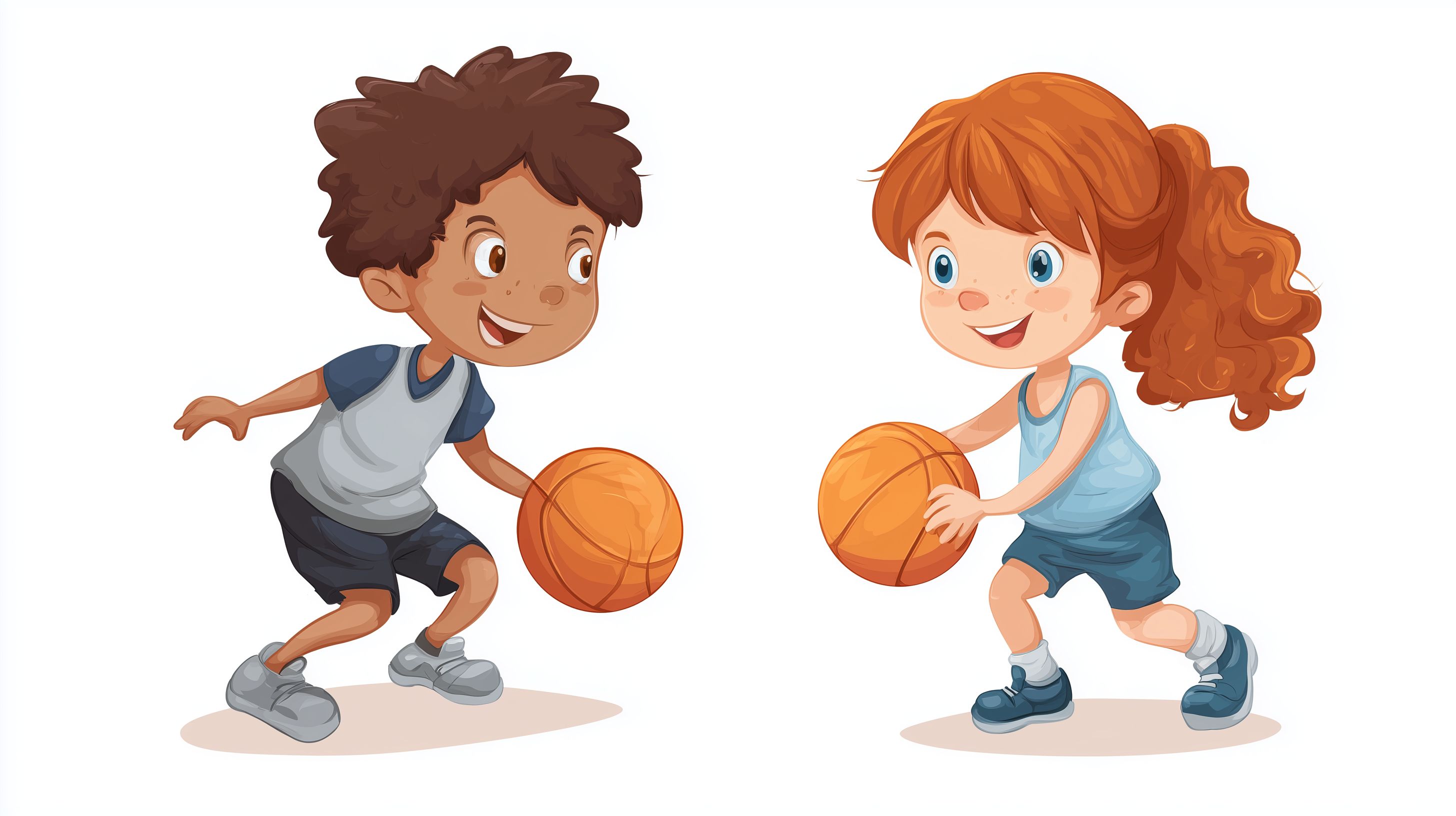 Die Illustration zeigt zwei fröhliche Kinder, die Basketball spielen. Ein Junge mit braunen Haaren und ein Mädchen mit roten Locken spielen lachend mit einem orangen Basketballball. Sie tragen sportliche Kleidung und Schuhe und bewegen sich dynamisch auf einer hellen Bodenfläche. Die kindliche, cartoon-artige Darstellung vermittelt eine lebendige, positive Atmosphäre und lässt sich gut für Illustrationen, Grafiken oder Werbung in Bezug auf Kinder, Sport, Aktivität und Freude einsetzen. Das hochauflösende, kostenlose Stockfoto ist unter der Creative Commons-Lizenz nutzbar.