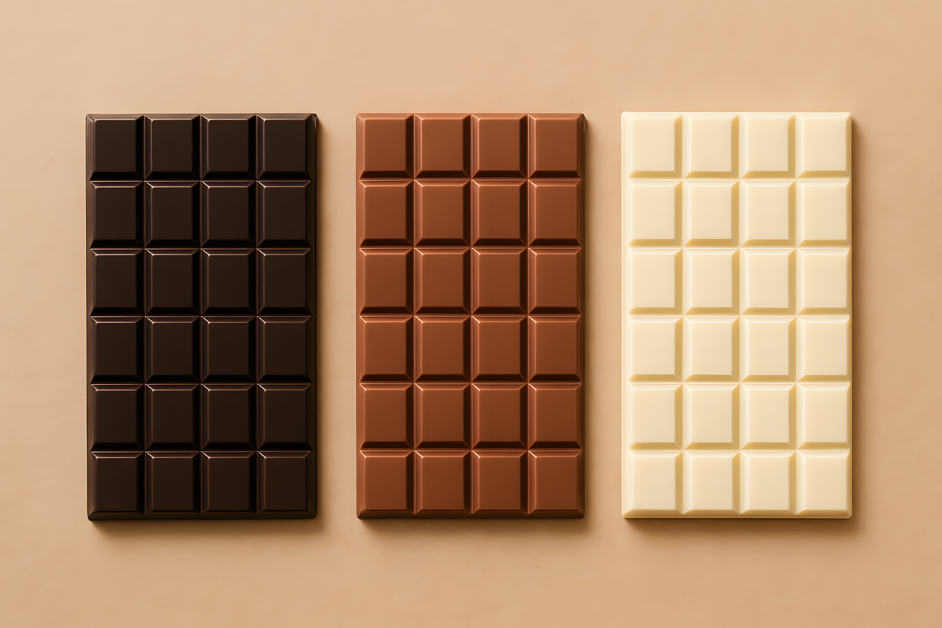 Dieses Stockfoto zeigt drei Tafeln Schokolade in verschiedenen Farbtönen nebeneinander auf einem beigen Hintergrund. Die Tafel auf der linken Seite ist dunkelbraune Zartbitterschokolade, in der Mitte sieht man eine Tafel Vollmilchschokolade und rechts befindet sich eine weiße Schokoladentafel. Die Schokoladentafeln sind in regelmäßige Quadrate unterteilt, die einen klassischen und minimalistischen Look erzeugen. Dieses Foto eignet sich hervorragend für den Einsatz in Artikeln, Blogs oder Social-Media-Beiträgen rund um das Thema Schokolade, Genuss und hochwertiges Produktdesign. Als kostenloses Stockfoto in hoher Auflösung und unter Creative-Commons-Lizenz kann es vielseitig verwendet werden.