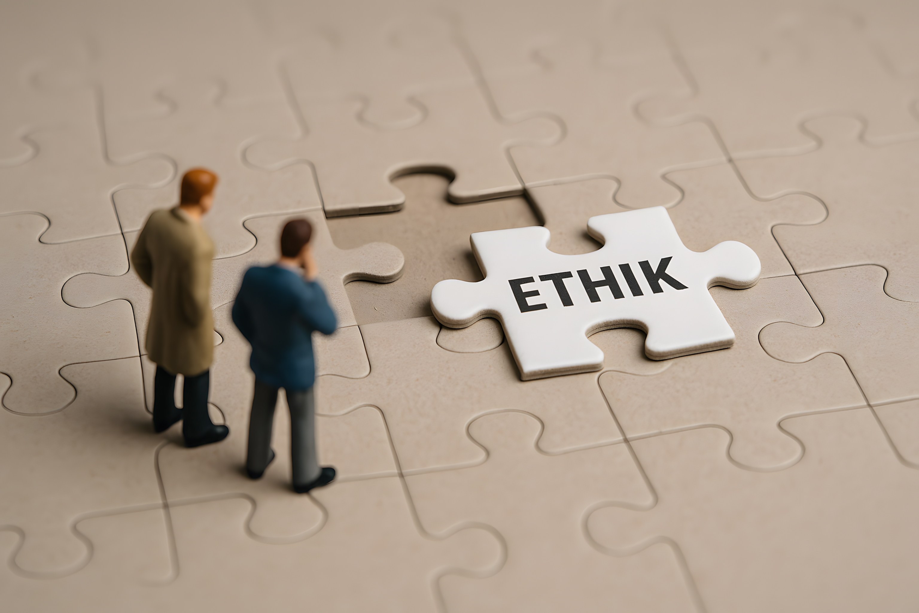 Dieses Konzeptfoto zeigt zwei Miniaturmänner, die vor einem Puzzle mit dem Wort 'ETHIK' stehen. Die Szenerie ist in Grautönen gehalten und hat einen minimalistischen, abstrakten Charakter. Das Bild vermittelt Themen wie Führung, Management, Unternehmensentscheidungen und die Bedeutung von Ethik in der Geschäftswelt. Es eignet sich hervorragend für den Einsatz in Blogbeiträgen, Newslettern, Social-Media-Posts oder Werbekampagnen zu Themen wie Unternehmensführung, Strategieentwicklung oder Geschäftsethik. Dieses hochauflösende Stockfoto steht unter einer Creative-Commons-Lizenz zur Verfügung.