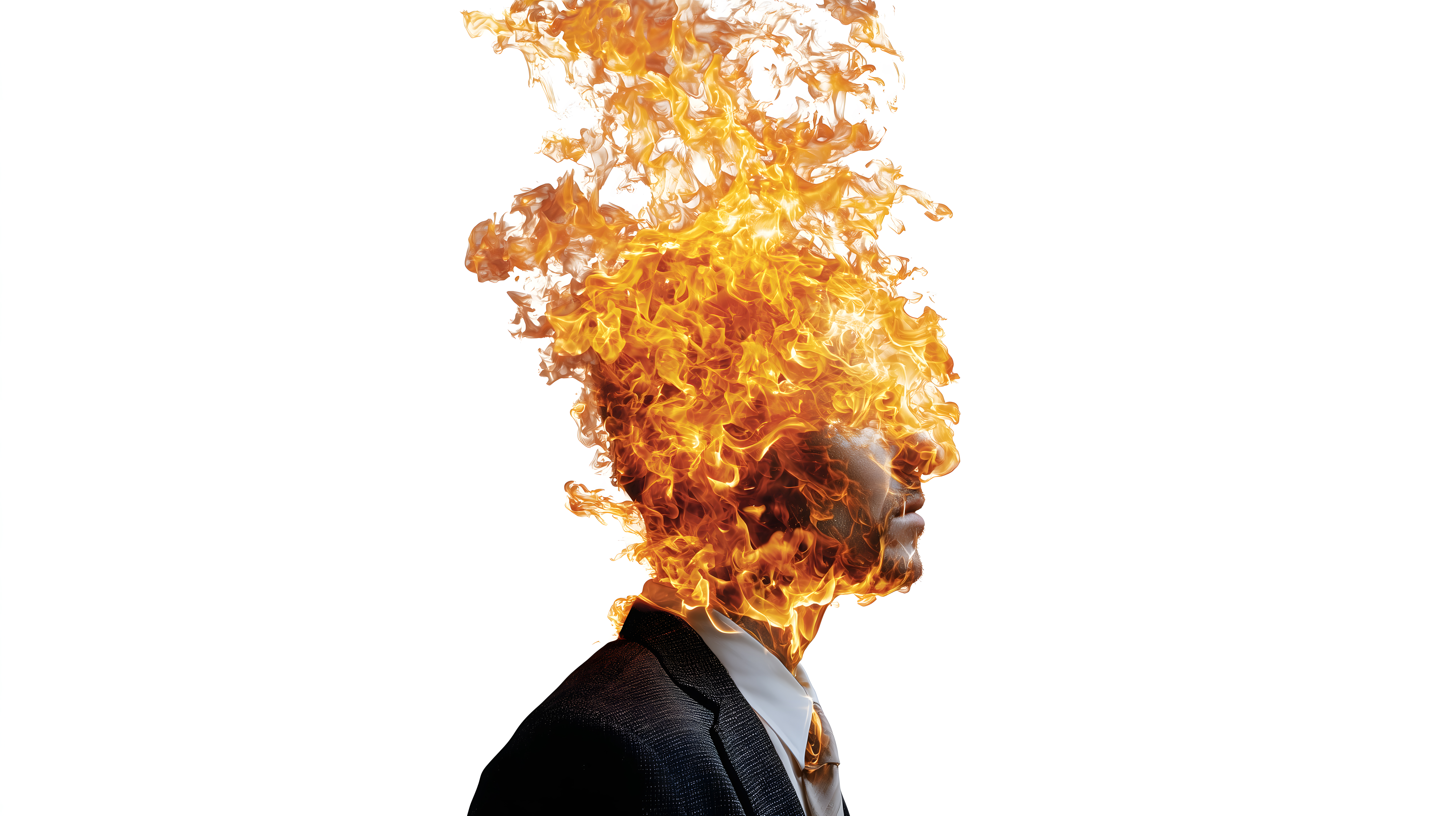 Dieses eindrucksvolle Fotoporträt zeigt einen Mann, dessen Kopf in Flammen steht. Die Darstellung stellt eine visuelle Metapher für mentale Anspannung, Überforderung und innere Unruhe dar. Der Mann im Anzug verkörpert dabei den modernen Geschäftsmann, der mit den Herausforderungen seiner Arbeit zu kämpfen hat.