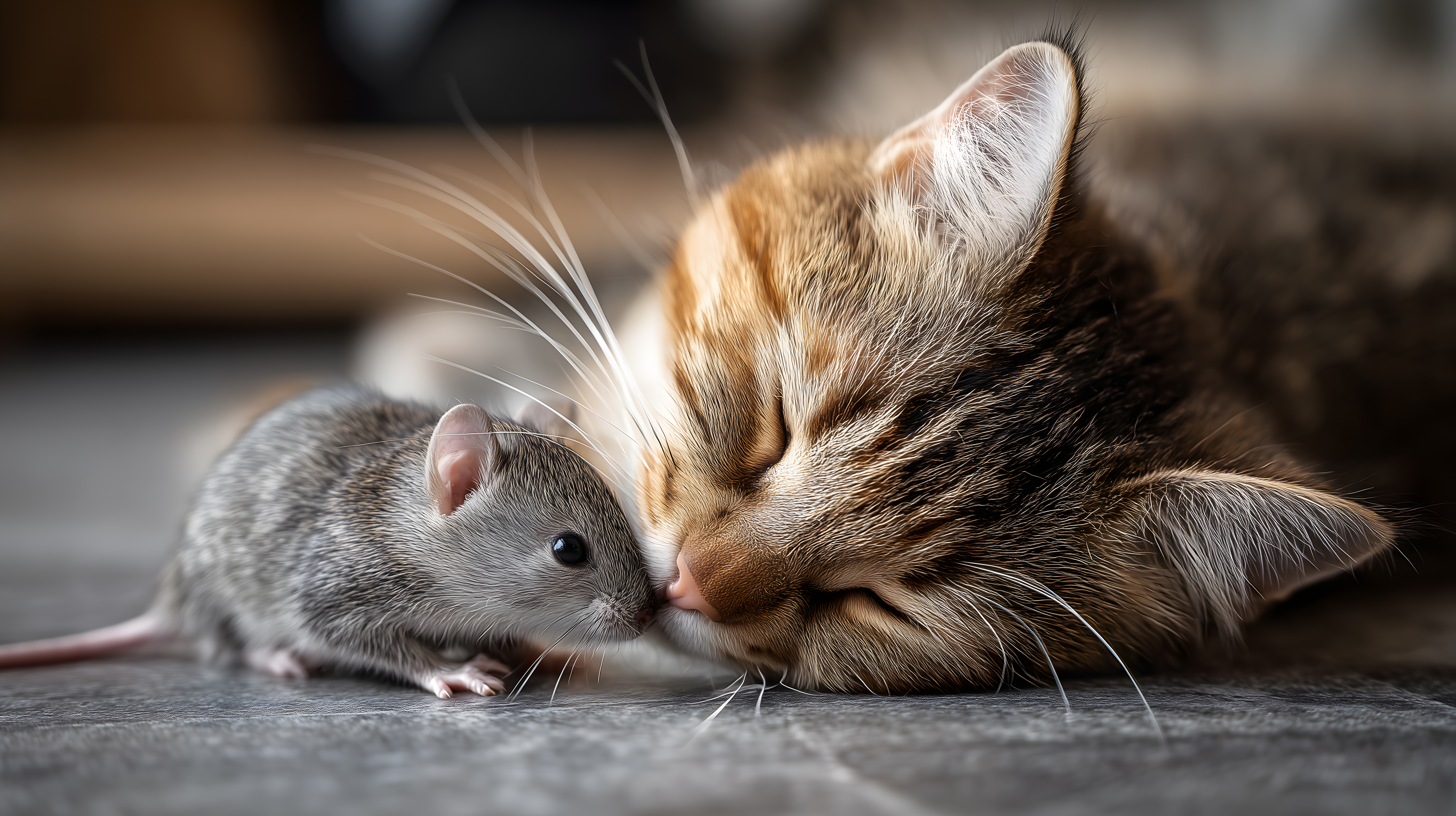 Das Bild zeigt eine Nahaufnahme einer Katze, die eine Maus auf einem Fliesenboden versteckt. Die Katze beugt sich zärtlich über die Maus, als wolle sie diese beschützen. Das Spiel zwischen Jäger und Beute wird hier auf eine einfühlsame Art dargestellt, die Szene wirkt friedlich und intim. Die Schärfentiefe ist gering, wodurch der Fokus auf den beiden Tieren liegt. Die warmen Brauntöne der Katze und die grauen Nuancen der Maus schaffen einen stimmungsvollen Kontrast auf dem dunklen Fliesenboden. Dieses kostenlose Stockfoto in hoher Auflösung eignet sich hervorragend für Blogbeiträge, Social-Media-Posts oder Werbematerialien rund um Haustiere, Tierfreundschaft oder das Thema Natur.