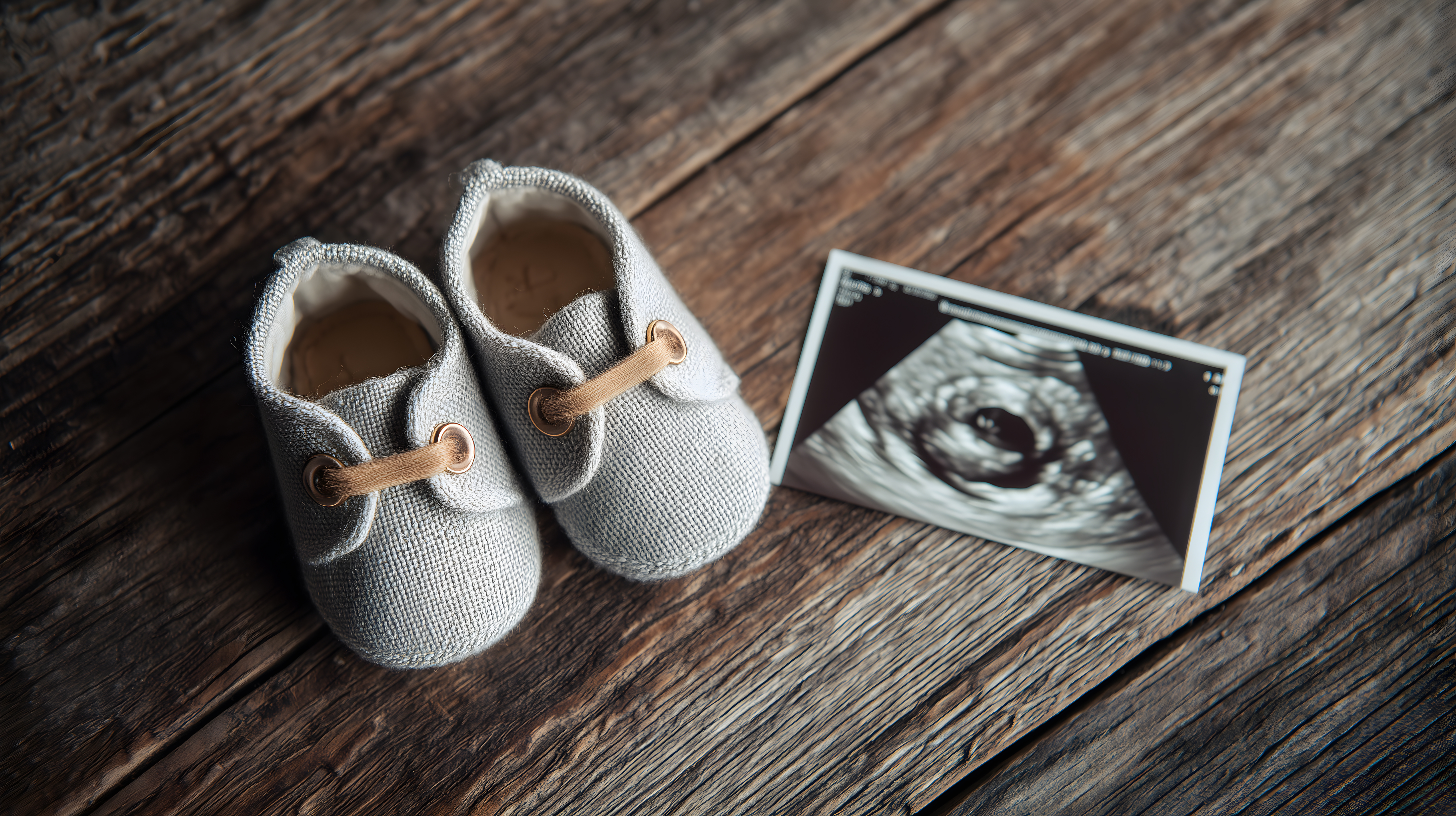 Das Bild zeigt ein paar graue Babyschuhe und ein Ultraschallbild auf einem rustikalen Holztisch. Die Schuhe sind aus einem weichen, grauen Stoff gefertigt und mit beigen Schnürsenkeln versehen, die einen natürlichen, handgefertigten Charakter verleihen. Neben den Schuhen liegt ein Ultraschallbild, das den ersten Blick auf das ungeborene Baby zeigt und die Vorfreude auf die Geburt symbolisiert. Die warmen Brauntöne des Holztisches bilden einen schönen Kontrast zu den einfarbigen, neutralen Elementen und verleihen dem Bild eine gemütliche, intime Atmosphäre. Diese Szene eignet sich hervorragend als kostenloses Stockfoto für Artikel oder Werbematerialien rund um Schwangerschaft, Geburt und Babypflege. Das hochauflösende Bild steht unter Creative Commons-Lizenz zur Verfügung.