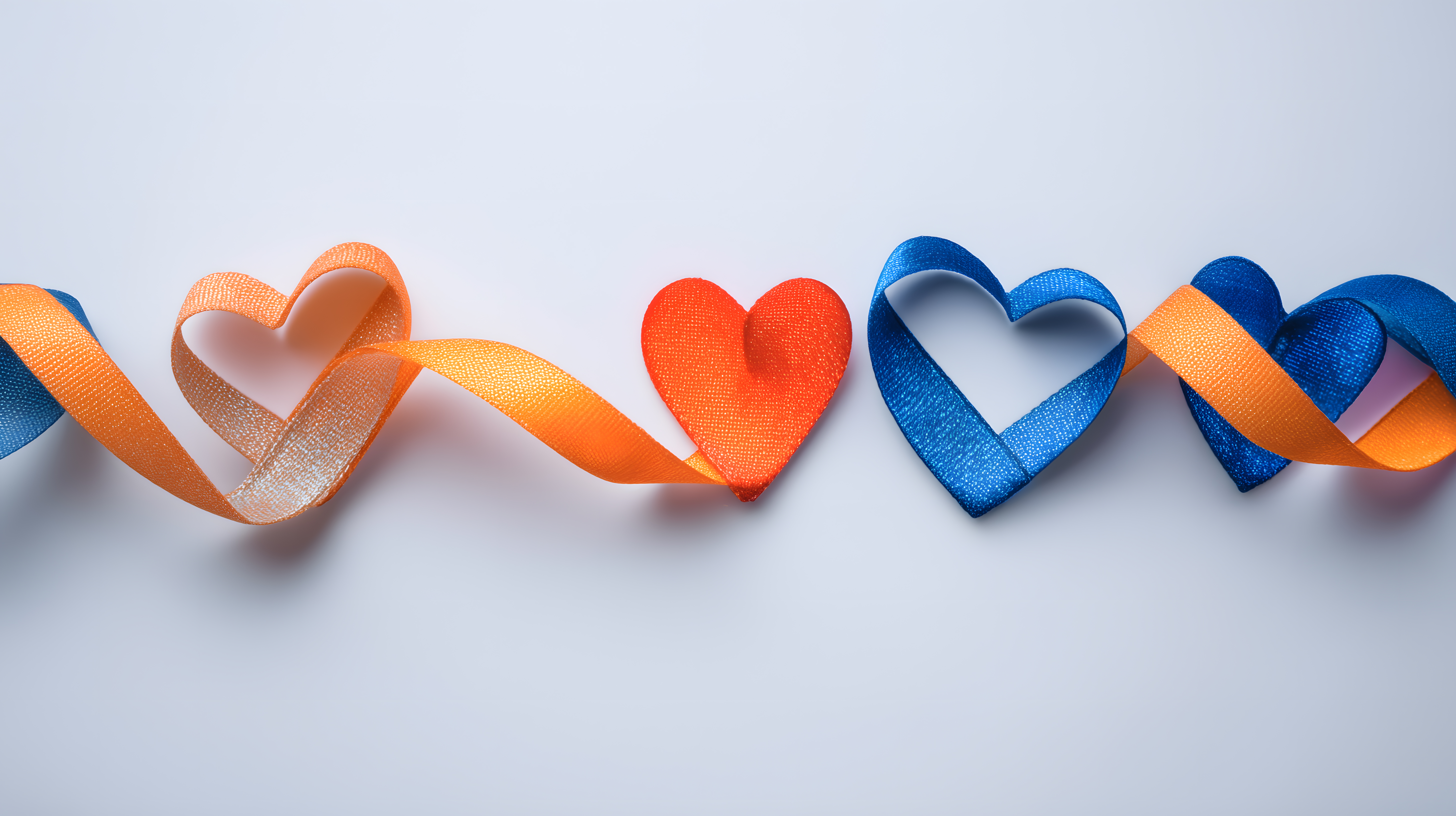 Dieses Bild zeigt bunte Herz-Schleifen vor weißem Hintergrund. Die Schleifen sind in leuchtenden Farben wie Orange und Blau gehalten und erinnern an Dekorationen für Valentinstag, Hochzeit oder andere Feiern. Die Komposition mit den ineinander verschlungenen Herzen verleiht dem Bild eine romantische und liebevolle Atmosphäre. Das Foto eignet sich hervorragend als kostenloses Stockfoto für Blogs, Newsletter, soziale Medien und Werbematerialien zum Thema Liebe, Partnerschaft oder Familienfeiern. Es ist in hoher Auflösung und unter einer Creative-Commons-Lizenz verfügbar.