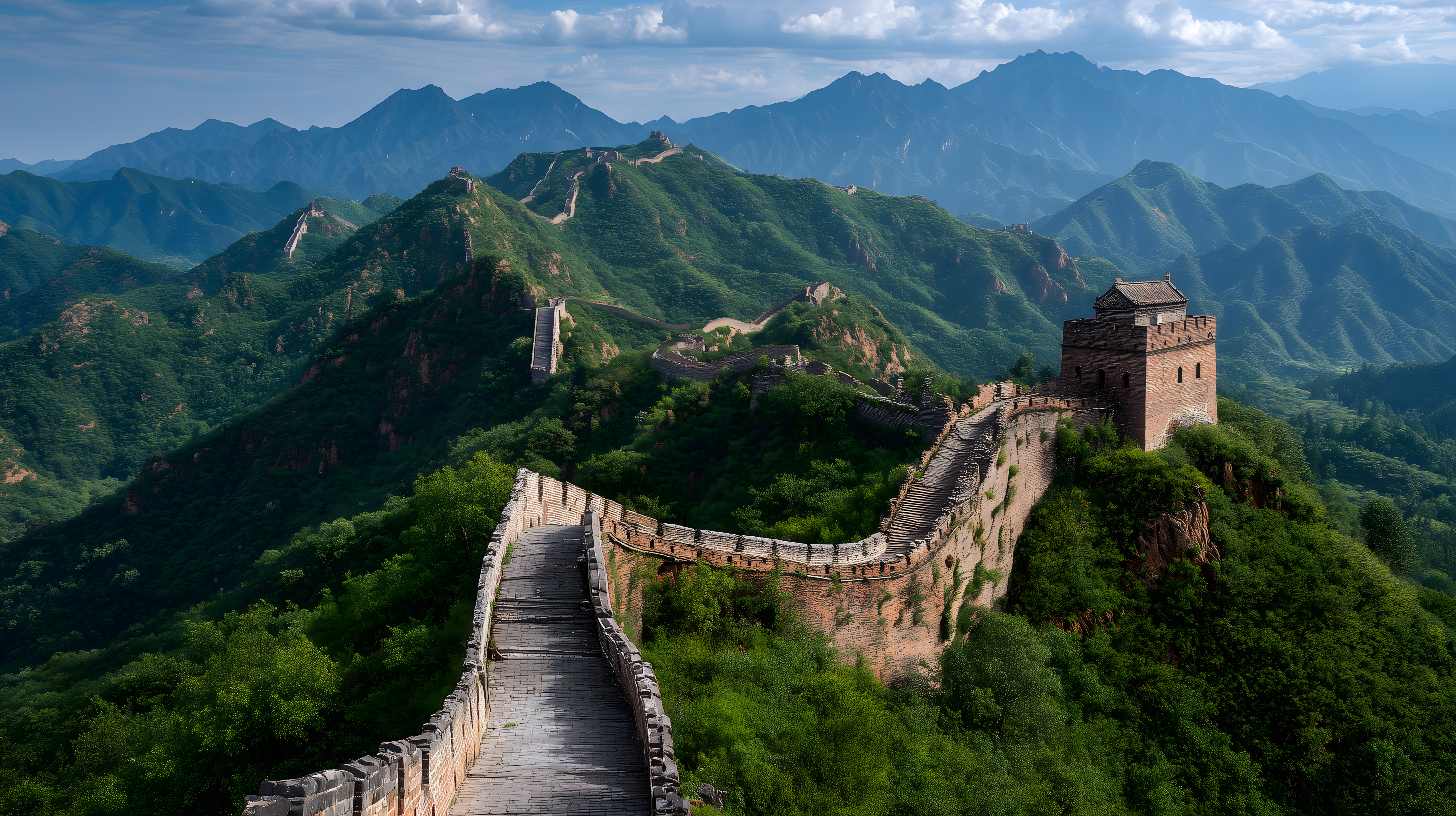 Das Bild zeigt einen beeindruckenden Ausschnitt der Chinesischen Mauer, eingebettet in eine majestätische Berglandschaft. Die historische Festungsanlage schlängelt sich über die grünen Hügel, gekrönt von einem Wachturm, der einen atemberaubenden Ausblick ermöglicht. Der blaue Himmel mit vereinzelten Wolken verleiht der Szenerie eine friedvolle Atmosphäre. Dieses außergewöhnliche Foto eignet sich hervorragend als kostenloses Stockfoto für Blogs, Newsletter, Social-Media-Kanäle und Werbematerial in hoher Auflösung und unter der Creative-Commons-Lizenz.