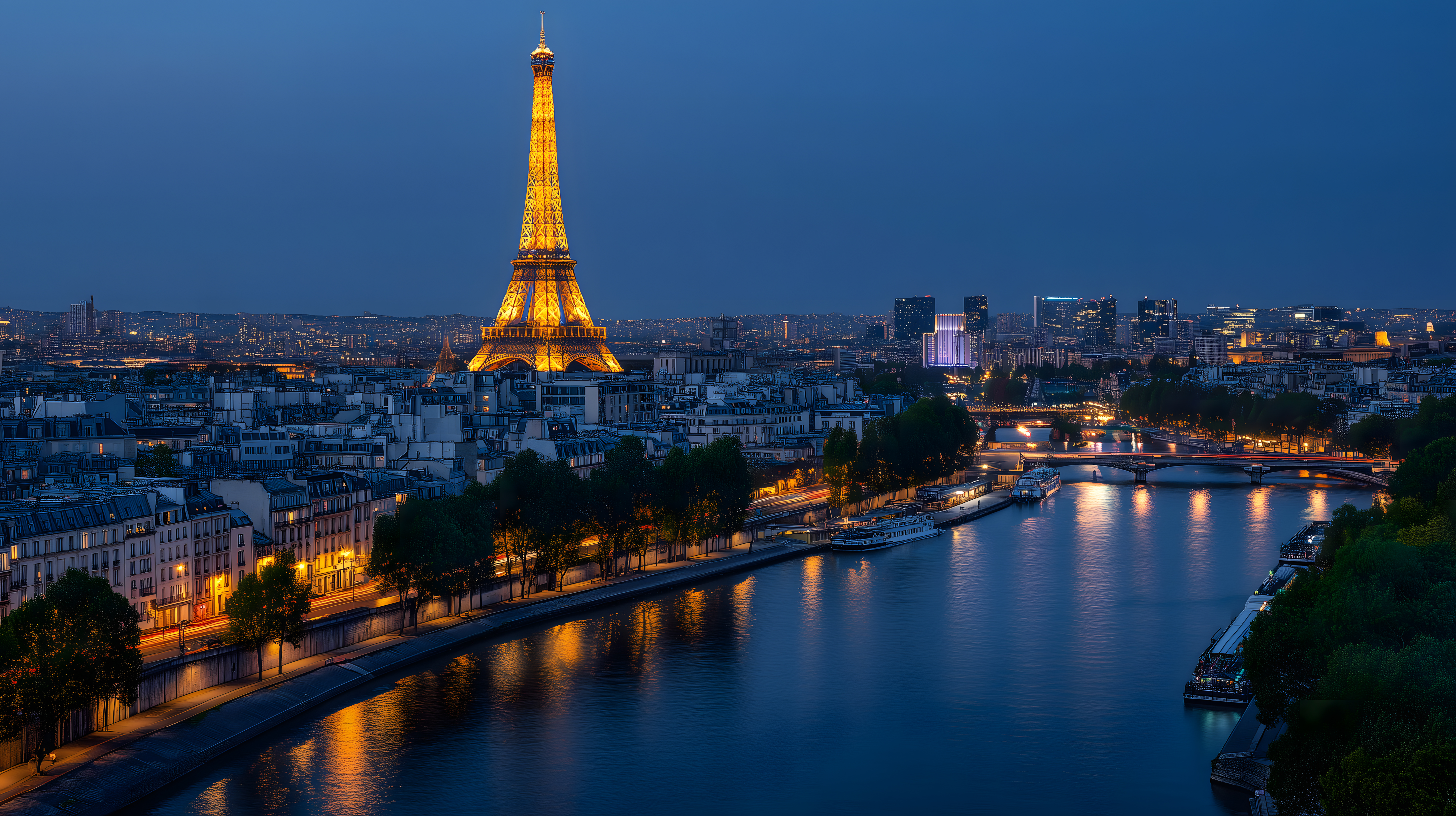 Das Bild zeigt den ikonischen Eiffelturm in Paris bei Nacht, beleuchtet in warmem, goldenem Licht. Der Blick geht über den Fluss Seine, dessen Wasser die Beleuchtung und die umliegenden Gebäude und Brücken widerspiegelt. Die Skyline der Stadt ist im Hintergrund zu sehen, mit weiteren Hochhäusern und Wahrzeichen. Die Szene vermittelt eine romantische, stimmungsvolle Atmosphäre in der Blauen Stunde. Dieses hochauflösende, kostenlose Stockfoto unter Creative Commons-Lizenz eignet sich hervorragend für den Einsatz in Blogs, Newslettern, Social-Media-Beiträgen oder Werbematerialien zum Thema Paris, Reise und Architektur.