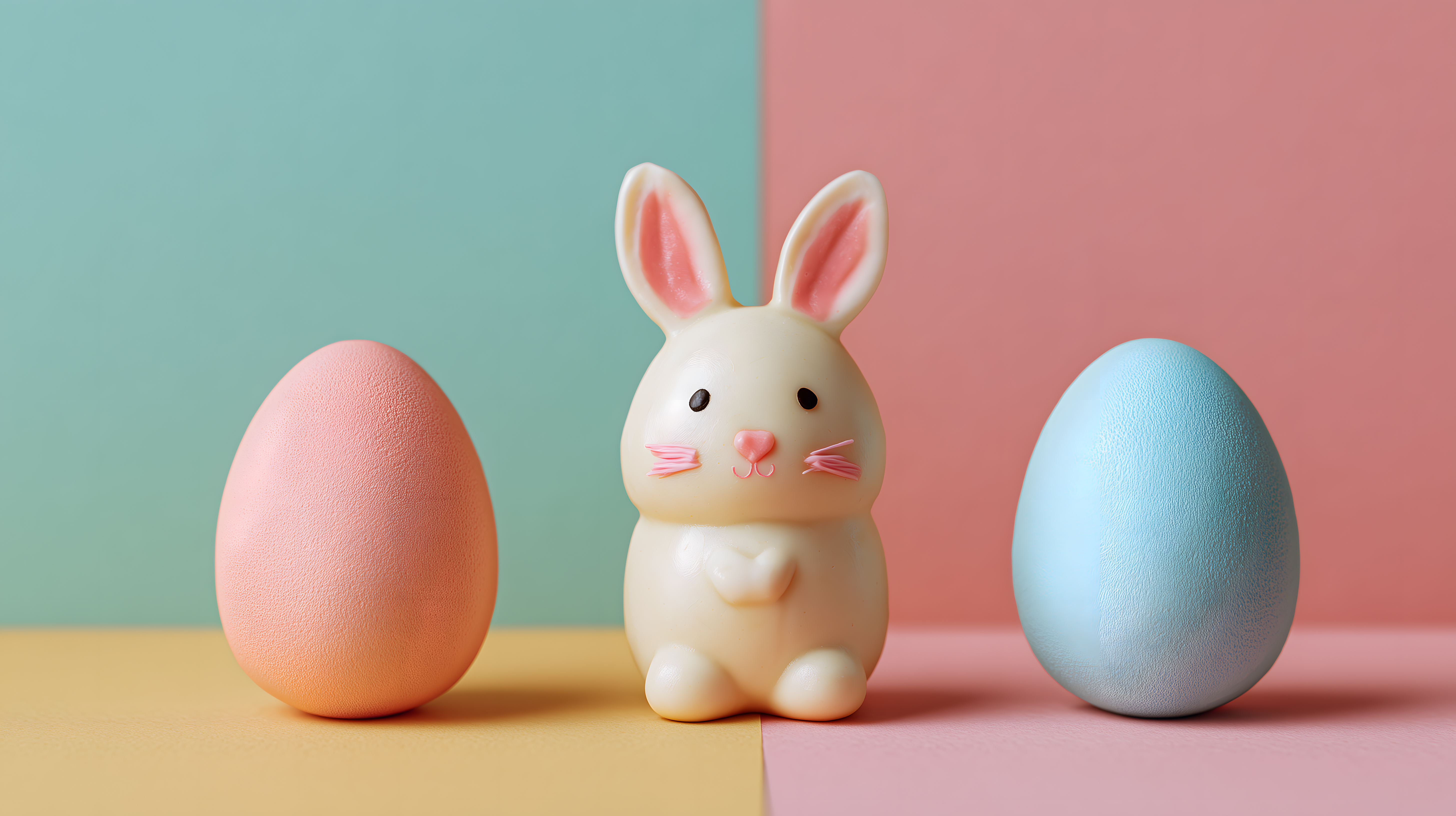 Dieses Foto zeigt einen minimalistischen und farbenfrohen Osterhintergrund. Im Mittelpunkt steht ein süßer, weißer Plüschosterhase, der zwischen zwei Ostereiern in unterschiedlichen Pastellfarben platziert ist. Der Hase hat große, rosafarbene Ohren und einen kleinen, schwarzen Knopfnase, die dem Bild einen niedlichen, verspielten Charakter verleihen. Die Eier, in Pastelltönen von Hellblau bis Dunkelrosa, ergänzen die Szenerie harmonisch. Der Hintergrund besteht aus drei Farbflächen in Mintgrün, Koralle und Gelb, die eine klare, moderne Ästhetik schaffen. Dieses Bild eignet sich hervorragend für Oster-Designs, Frühlingsdekorationen oder Werbekampagnen rund um das Thema Ostern in hoher, kostenfreier Auflösung unter einer Creative-Commons-Lizenz.