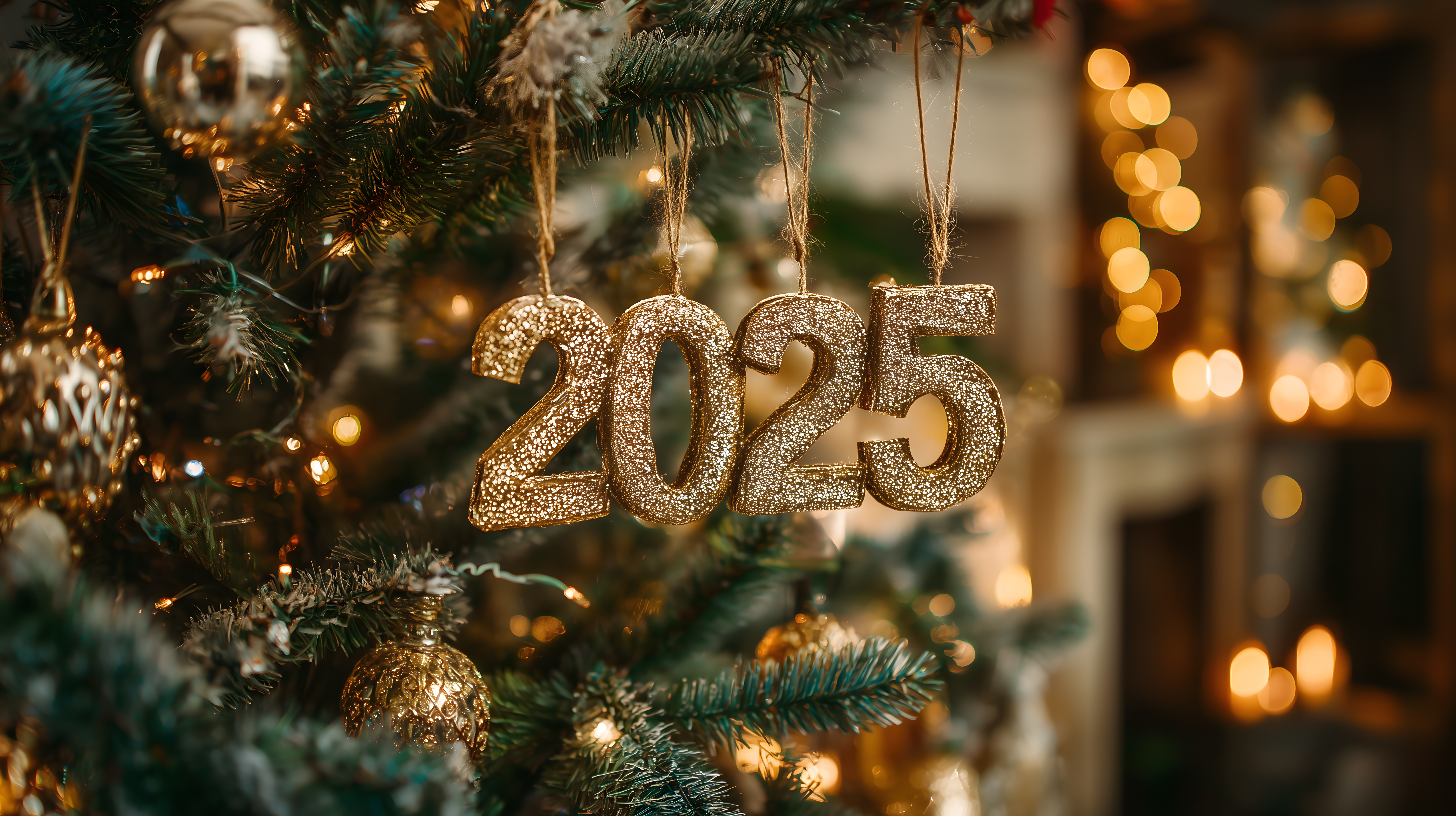 Dieses Foto zeigt eine stimmungsvolle Weihnachtsdekoration mit einer Tanne, die mit goldenen Kugeln und Ornamenten geschmückt ist. Im Vordergrund hängen die goldenen Zahlen '2025' als Blickfang an den Zweigen. Der Fokus liegt auf der festlichen Atmosphäre und den Details der Deko, die mit der verschwommenen Umgebung einen schönen Kontrast bildet. Das Bild eignet sich perfekt als Hintergrund für Neujahrskarten, Weihnachtsgrüße oder Werbeaktionen in den Bereichen Handel, E-Commerce und Lifestyle. Als kostenloses, hochauflösendes Stockfoto unter Creative-Commons-Lizenz kann es vielfältig in Blogs, Social Media oder Printmedien eingesetzt werden.
