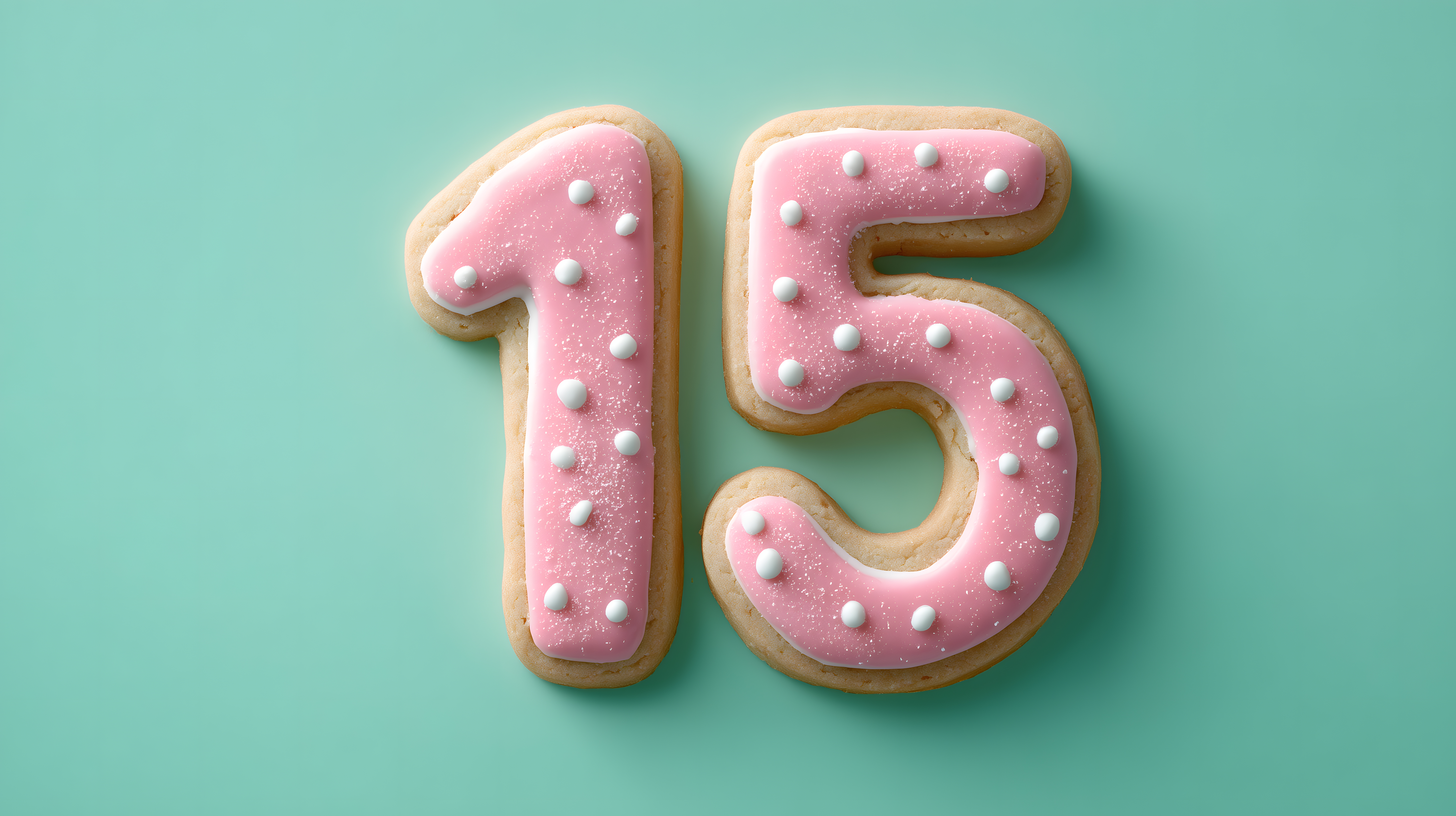 Dieses Foto zeigt zwei Kekse, die die Zahl 15 in rosa Glasur und weißen Punkten darstellen. Die Kekse liegen auf einem türkisfarbenen Hintergrund, wodurch die zarten Pastellfarben besonders hervorgehoben werden. Das Motiv eignet sich hervorragend für Geburtstagskarten, Einladungen, Blogbeiträge oder Social-Media-Posts rund um Jubiläen und Feiern. Dieses hochauflösende Stockfoto steht unter einer Creative-Commons-Lizenz zur freien Nutzung zur Verfügung.