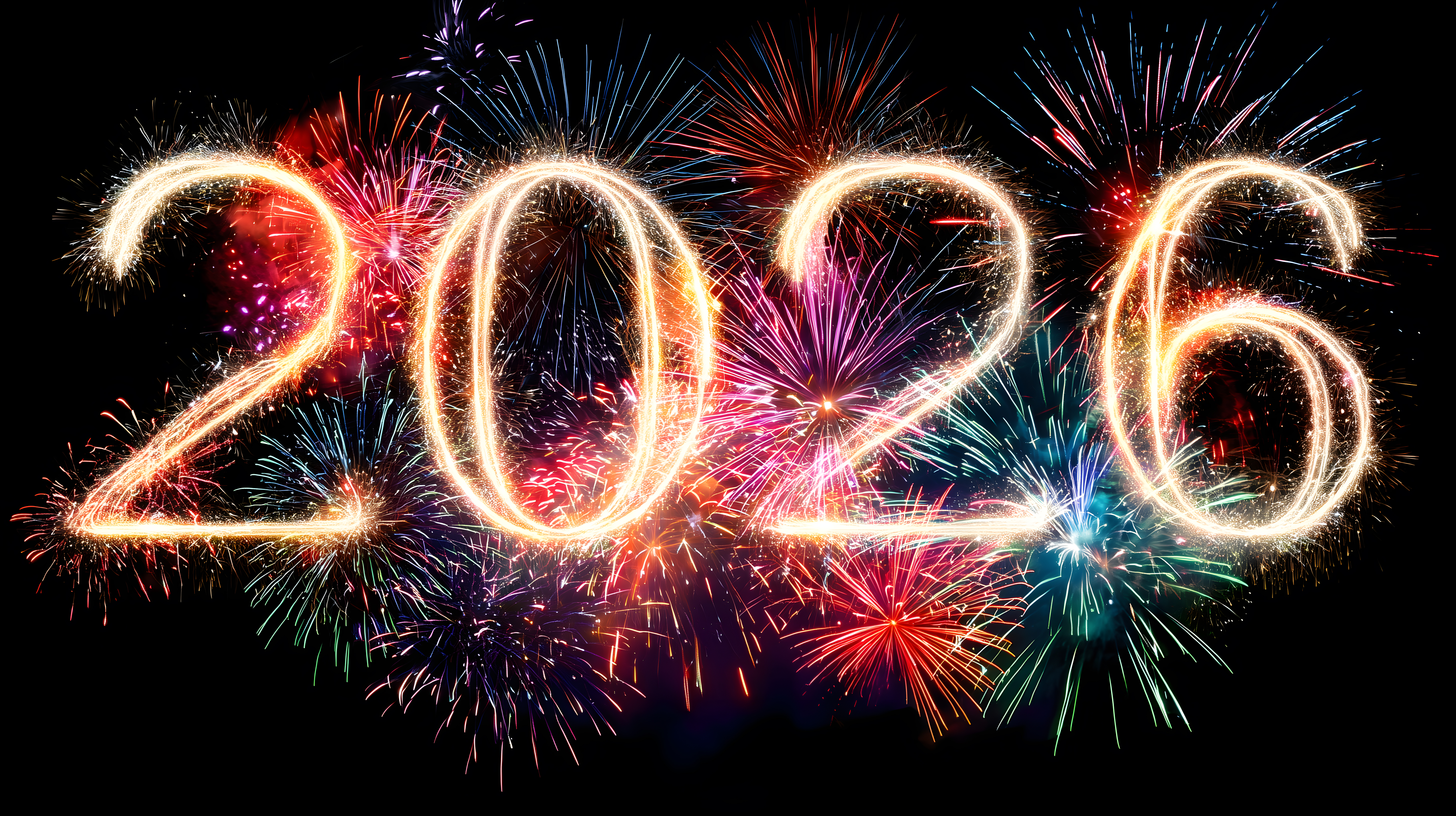 Dieses farbenprächtige Foto zeigt ein spektakuläres Feuerwerks-Display zum Jahreswechsel 2026. Im Vordergrund sind die in leuchtenden Farben geschriebenen Jahreszahlen '2026' zu sehen, umgeben von einer Explosion von Funken, Blitzen und Flammen am Nachthimmel. Das Bild vermittelt die Stimmung von Freude, Feierlaune und Aufbruch zum neuen Jahr. Das hochauflösende Stockfoto eignet sich perfekt für die Verwendung in Blogs, Newslettern, Social-Media-Beiträgen oder Werbematerialien rund um den Jahreswechsel. Es steht unter einer Creative-Commons-Lizenz zum kostenlosen Download zur Verfügung.