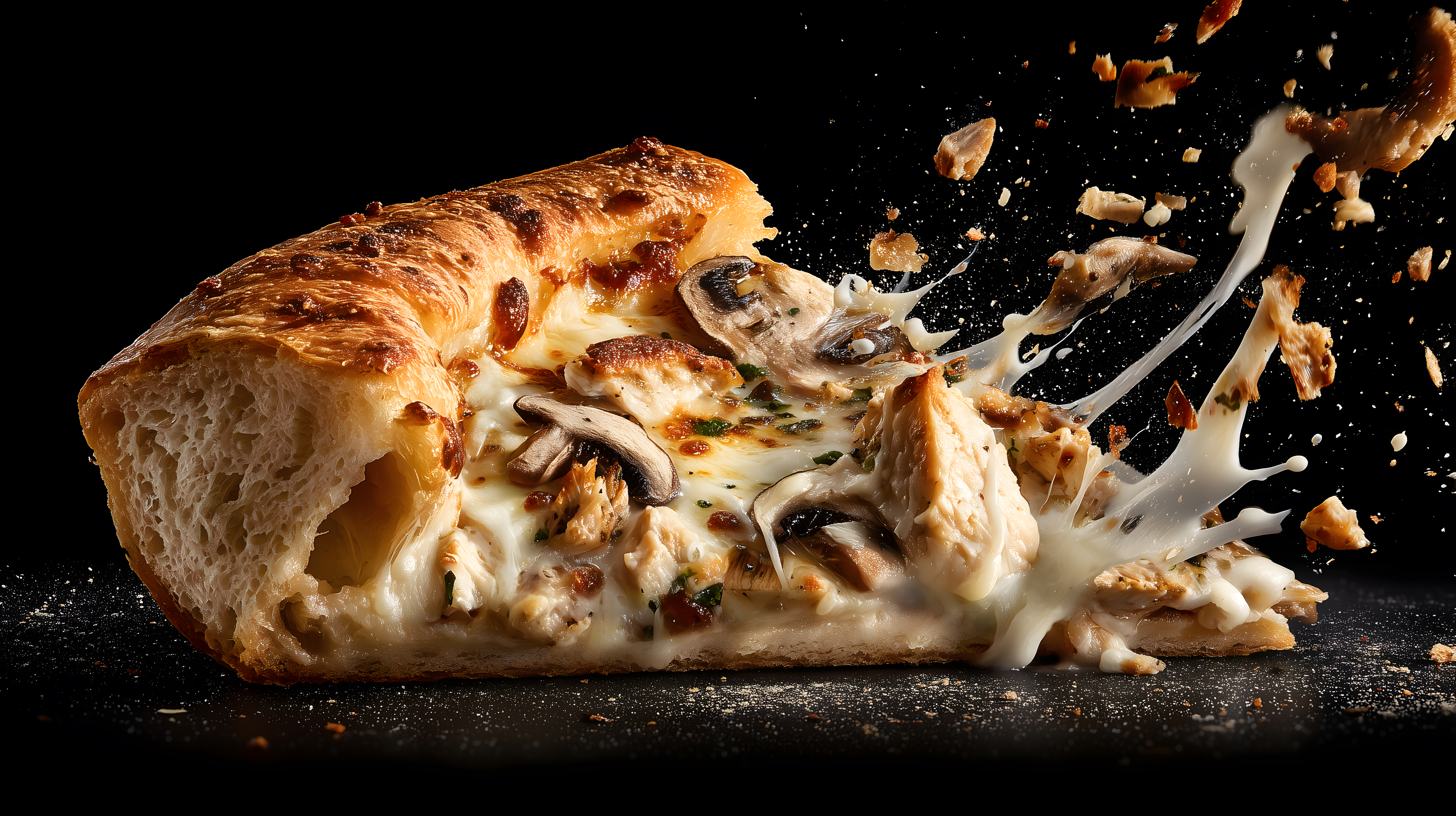 Dieses Foto zeigt ein frisch gebackenes Käse-Pilz-Brot in einer spektakulären Ansicht. Der Fokus liegt auf dem Brot, das gerade aus dem Ofen kommt und bei dem der Käse und die Pilze durch den Backvorgang köstlich zerlaufen sind. Durch den Kontrast zum dunklen Hintergrund und den Spritzeffekt wirkt das Bild sehr lebendig und appetitlich. Dieses hochauflösende Stockfoto eignet sich hervorragend für die Verwendung in Blogs, Newslettern, Social-Media-Beiträgen oder Werbekampagnen rund um Lebensmittel, Gastronomie und Backen. Es steht unter einer Creative-Commons-Lizenz zur kostenlosen Nutzung zur Verfügung.