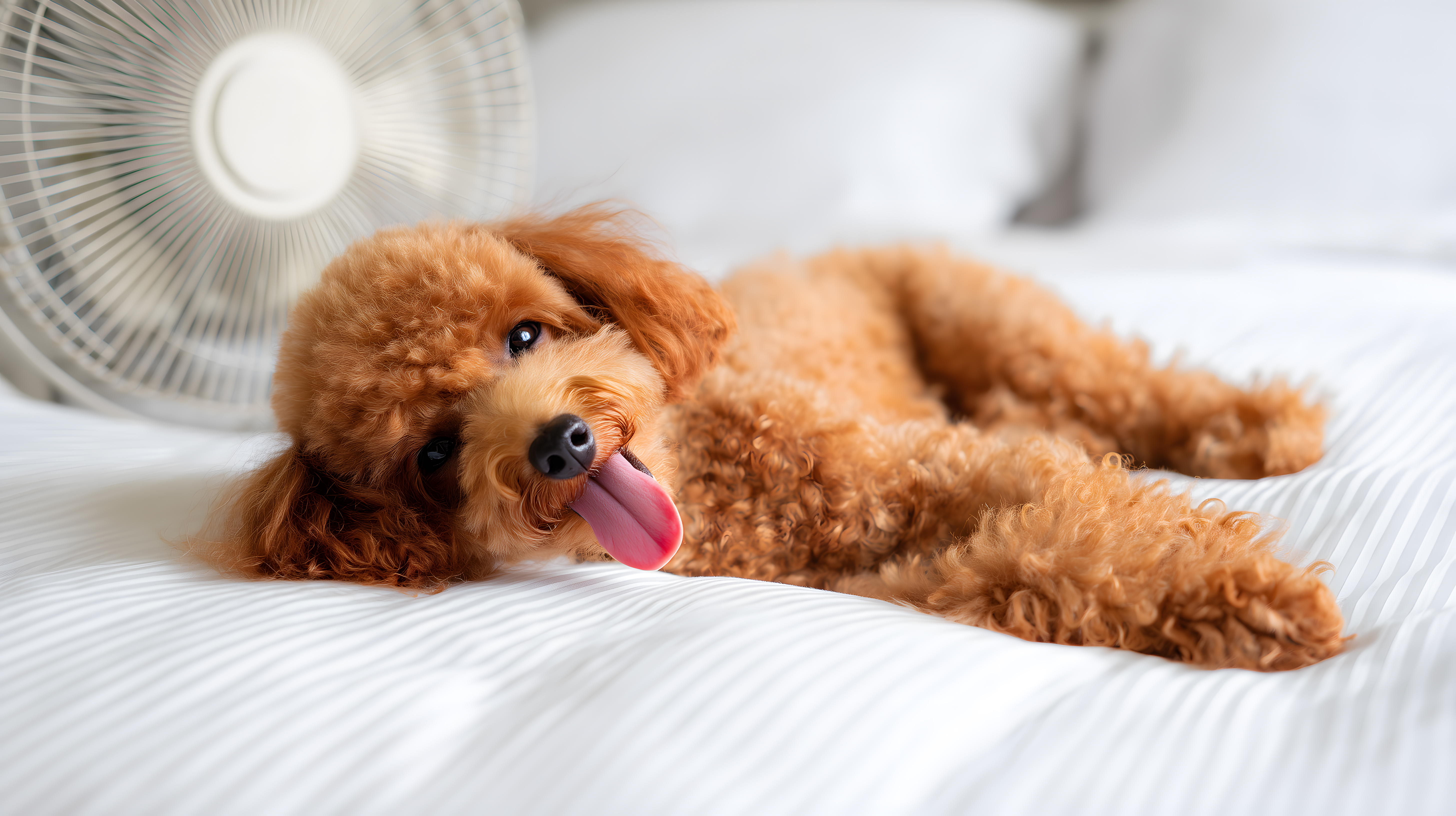 Das Foto zeigt einen erschöpften, braunen Pudel, der sich auf einem Bett vor einem laufenden Ventilator ausruht. Der Hund hat sein flauschiges Fell und seine rosa Zunge herausgestreckt, was auf eine angenehme Abkühlung nach einem anstrengenden Tag hindeutet. Die Szene vermittelt ein Gefühl von Entspannung und Erholung an einem heißen Sommertag. Dieses kostenlose Stockfoto in hoher Auflösung unter einer Creative-Commons-Lizenz eignet sich hervorragend für die Verwendung in Blogs, Newslettern, Social-Media-Beiträgen oder Werbematerialien, die eine gemütliche, tierische Atmosphäre vermitteln möchten.