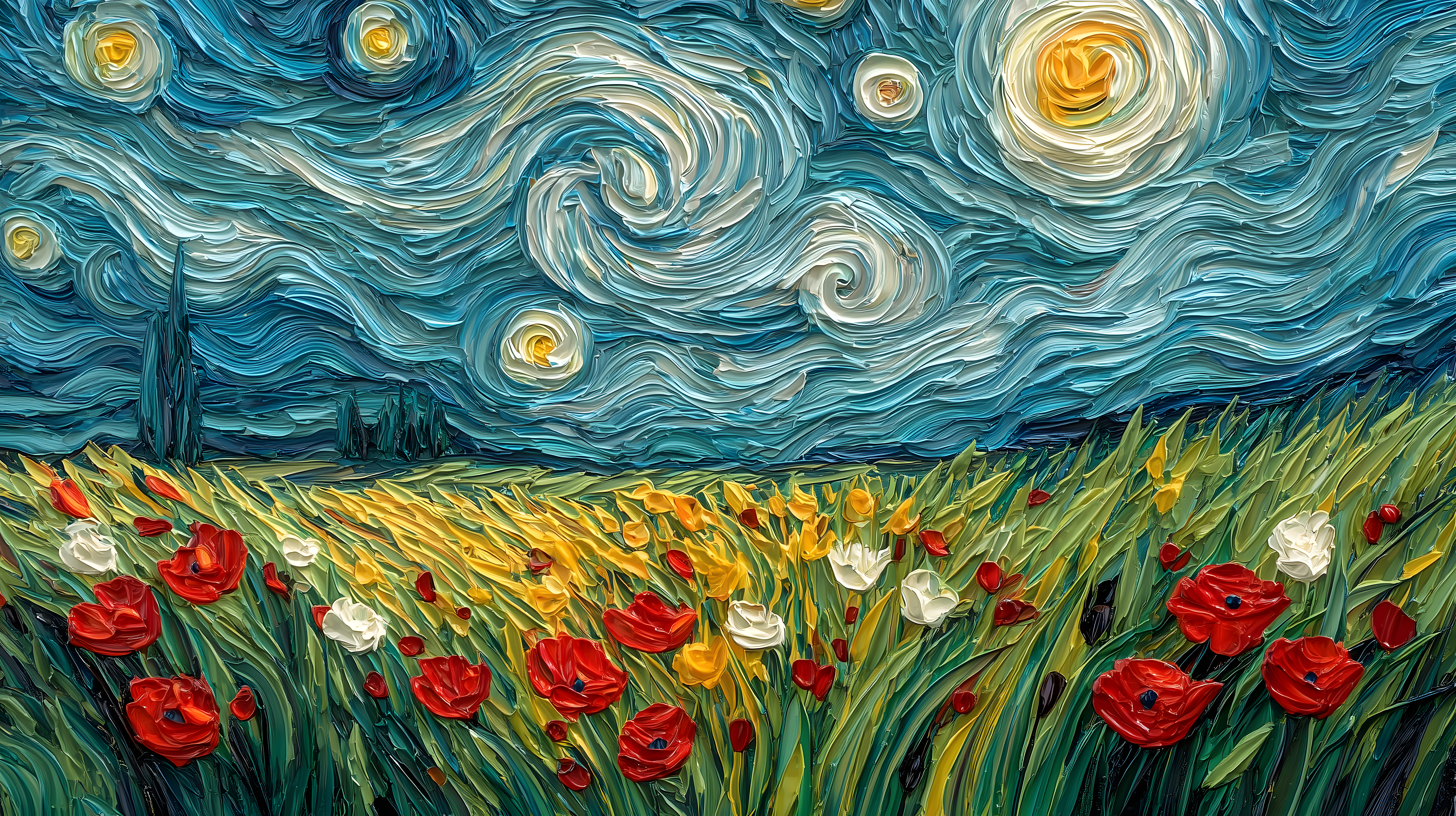 Dieses faszinierende Bild zeigt eine traumhafte Landschaft im unverkennbaren Stil des Künstlers Vincent van Gogh. Der Himmel ist in swirligen, tief-blauen Farbtönen gehalten, durchsetzt von leuchtenden Sternen, die eine märchenhafte Atmosphäre schaffen. Im Vordergrund erstreckt sich ein wogendes Blumenfeld, in dem Mohnblumen und Tulpen in kräftigen Rot- und Gelbtönen leuchten.