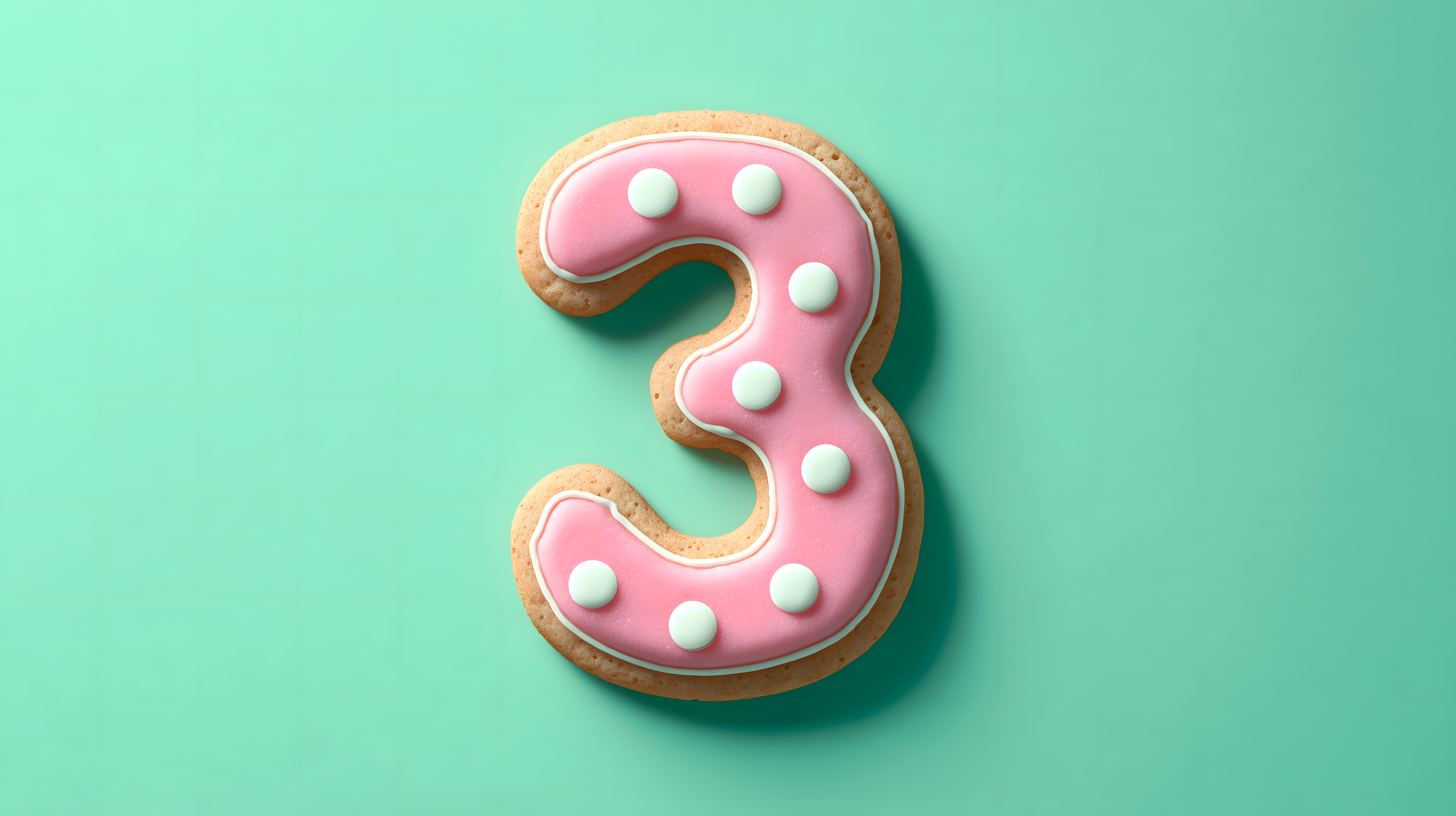 Dieses Foto zeigt einen dekorativen Keks in Form der Zahl 3 mit rosa Zuckerguss und weißen Punkten. Der Keks liegt vor einem einfarbigen, mintgrünen Hintergrund, der den Fokus ganz auf das Objekt lenkt. Die pastellige Farbgebung und die klare, reduzierte Komposition verleihen dem Bild einen modernen, minimalistischen Stil. Dieses Foto eignet sich hervorragend als kostenloses Stockfoto für Beiträge in Blogs, Newslettern oder auf Social-Media-Kanälen rund um Themen wie Backen, Gebäck, Geburtstage oder Feiern. Die hochauflösende Datei steht unter einer Creative-Commons-Lizenz zur Verfügung.