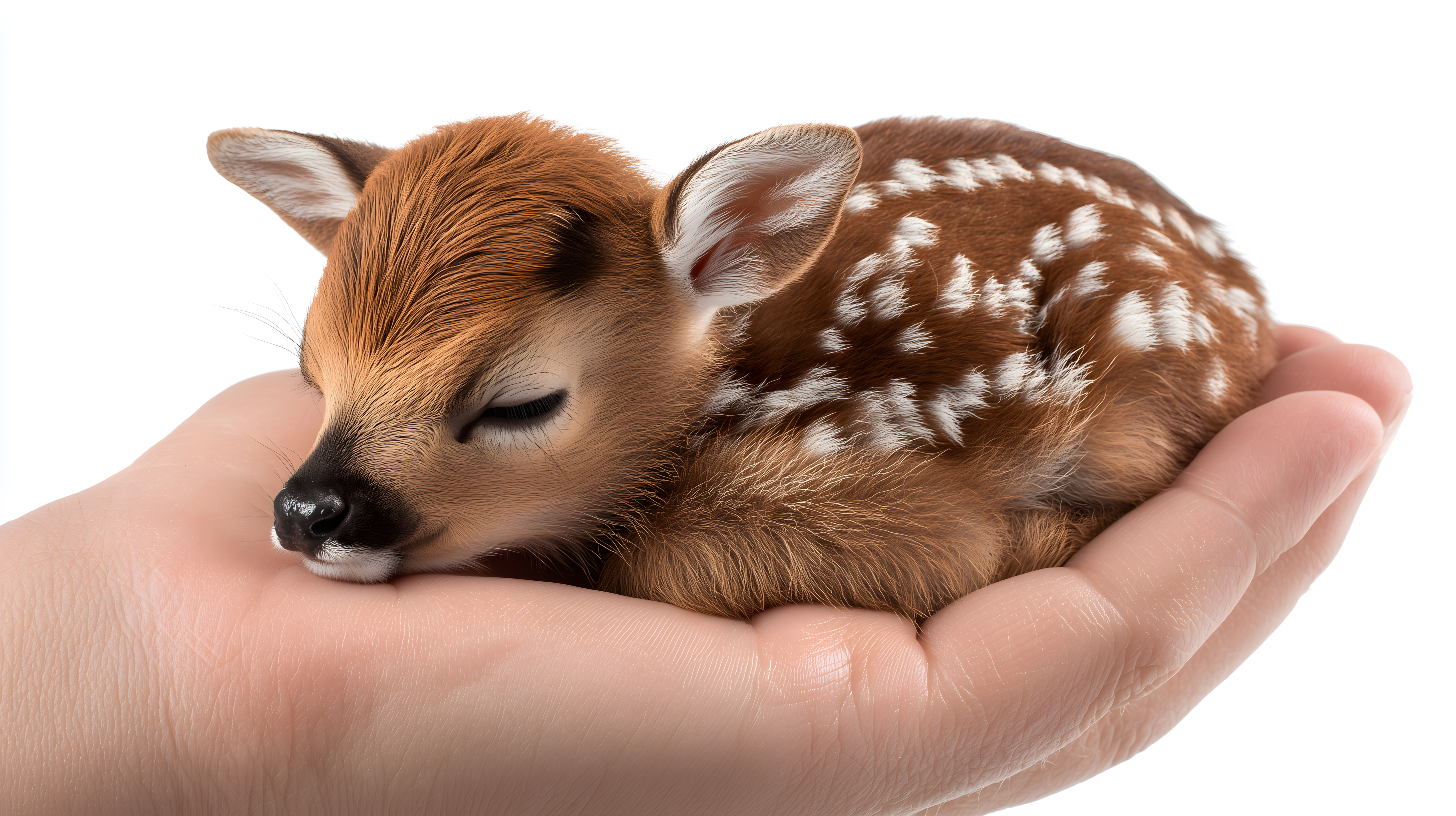 Das Bild zeigt ein niedliches, schlafendes Rehkitz, das sicher in einer Menschenhand ruht. Das kleine Tierbaby hat ein braunes, geflecktes Fell und seine Augen sind sanft geschlossen. Die Perspektive aus der Vogelperspektive und die Fokussierung auf das Rehkitz in der Handfläche erzeugen einen zarten, schutzbedürftigen Eindruck. Dieses hochauflösende Stockfoto eignet sich hervorragend für den Einsatz in Natur-Blogbeiträgen, Werbekampagnen zum Umweltschutz oder emotionalen Social-Media-Posts. Es steht unter einer kostenlosen Creative-Commons-Lizenz zur Verfügung.
