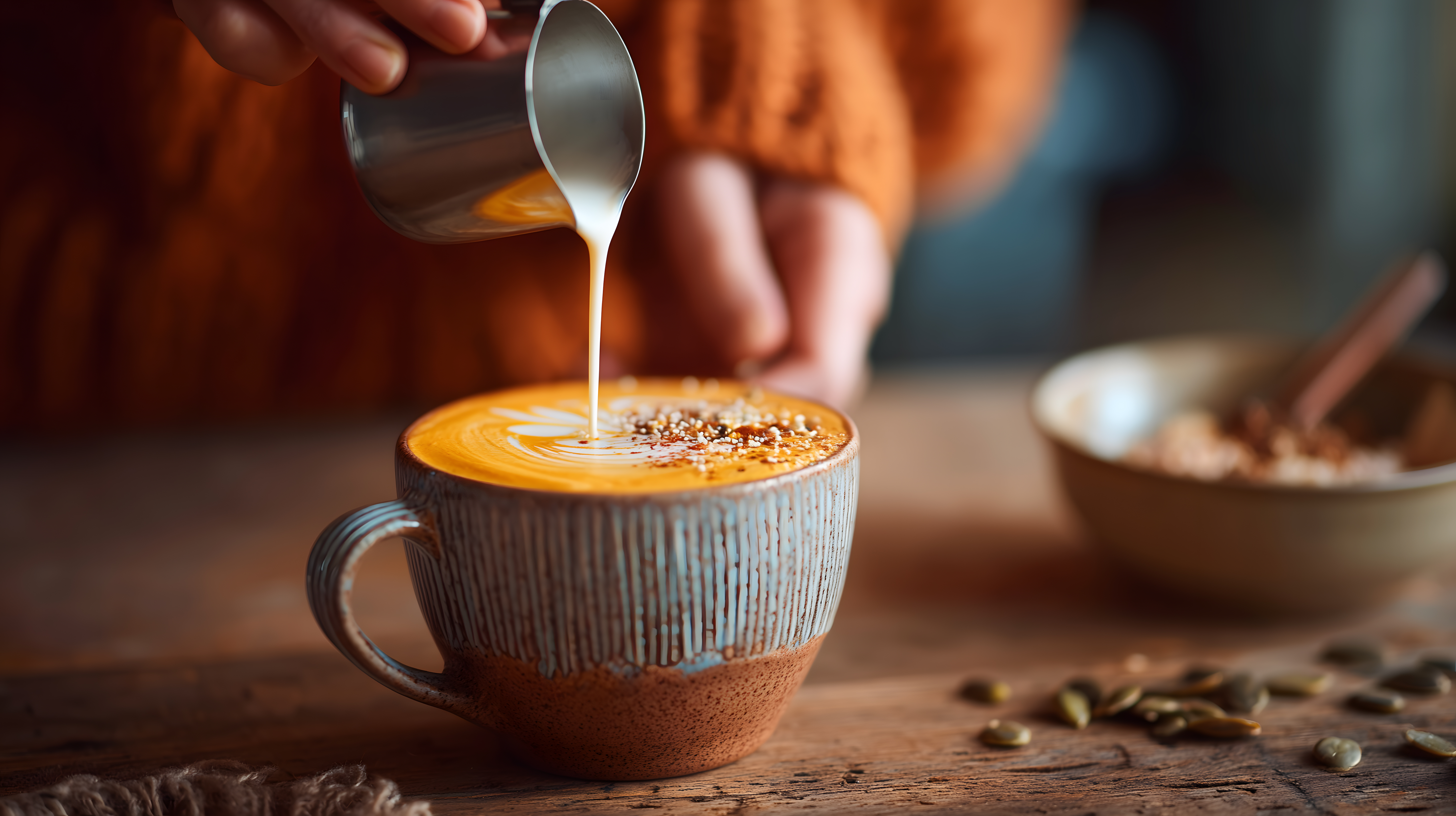 Das Bild zeigt einen Barista, der eine Pumpkin Spice Latte zubereitet. Er gießt geschäumte Milch in eine Keramiktasse, die auf einem rustikalen Holztisch steht. Die warme Herbstfärbung und die gemütliche Atmosphäre machen das Foto zu einem stimmungsvollen Motiv, das sich ideal für die Verwendung in Blogs, Newslettern oder sozialen Medien eignet. Dieses hochauflösende Stockfoto steht unter einer Creative-Commons-Lizenz zur freien Nutzung zur Verfügung.