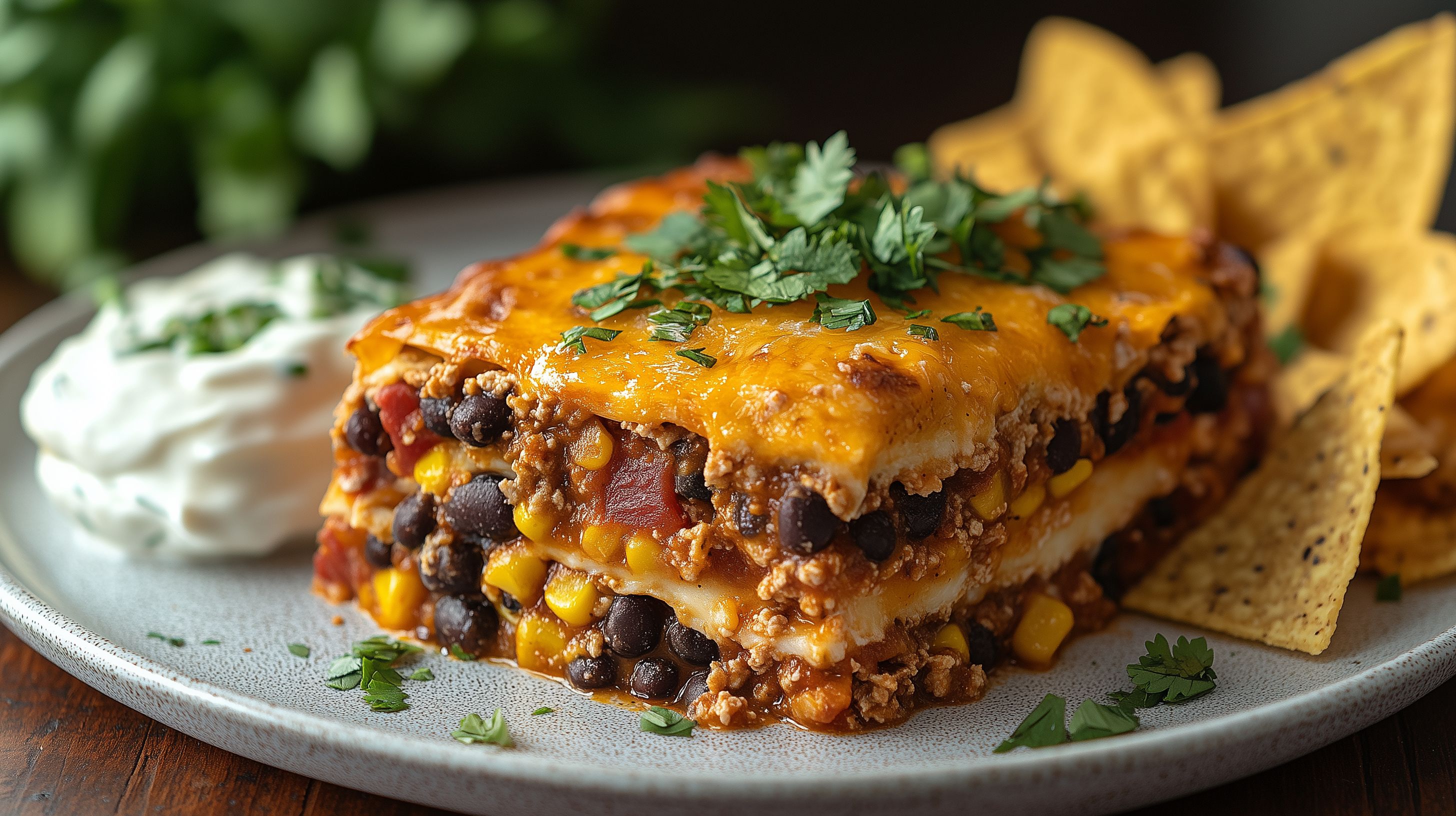 Das Bild zeigt einen appetitlichen mexikanischen Auflauf mit würzigem Rindfleisch und geschmolzenem Käse darüber. Der Auflauf ist in einer rustikalen Schale auf einem Holztisch angerichtet und mit frischen Kräutern wie Petersilie dekoriert. Die kräftigen Farben von Rot, Orange und Grün verleihen dem Gericht eine einladende Optik. Dieses Foto eignet sich hervorragend als kostenloses Stockfoto für Food-Blogs, Rezept-Websites oder Social-Media-Beiträge rund um mexikanische Küche und herzhafte Aufläufe in hoher Auflösung und unter Creative-Commons-Lizenz.