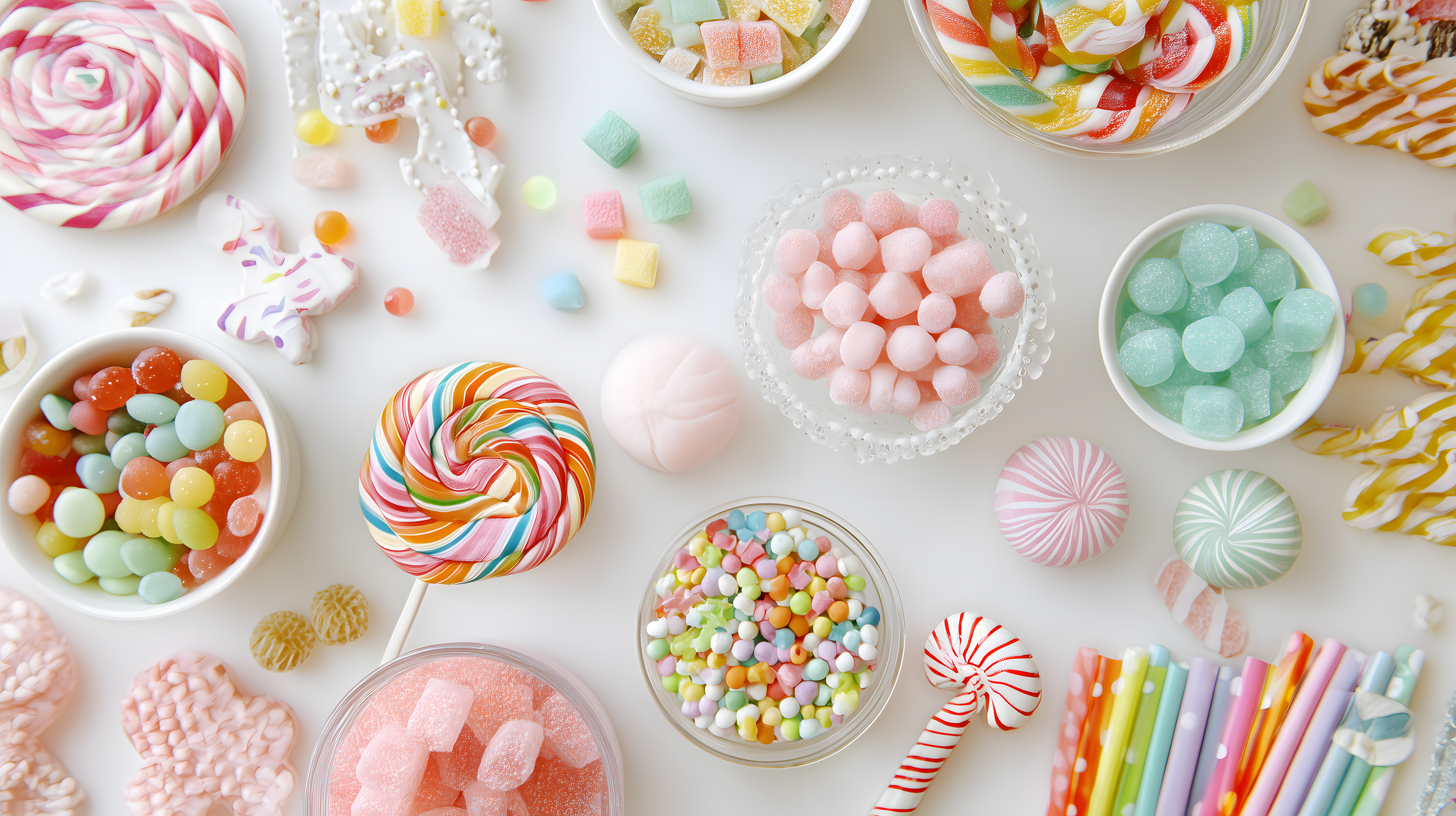 Dieses farbenfrohe und detailreiche Foto zeigt eine Vielzahl von bunten Süßigkeiten und Bonbons auf einem weißen Tisch angeordnet. Im Vordergrund sind rosa Marshmallows, bunte Gummibärchen, Lollipops und andere Naschereien in verschiedensten Formen und Farben zu sehen. Der Hintergrund ist schlicht gehalten, so dass die Süßigkeiten perfekt in Szene gesetzt werden. Dieses kostenlose Stockfoto in hoher Auflösung eignet sich ideal für den Einsatz in Blogs, Social-Media-Beiträgen, Newslettern oder Werbematerialien rund um das Thema Süßigkeiten, Snacks und Dekor. Es steht unter einer Creative-Commons-Lizenz zur Verfügung.