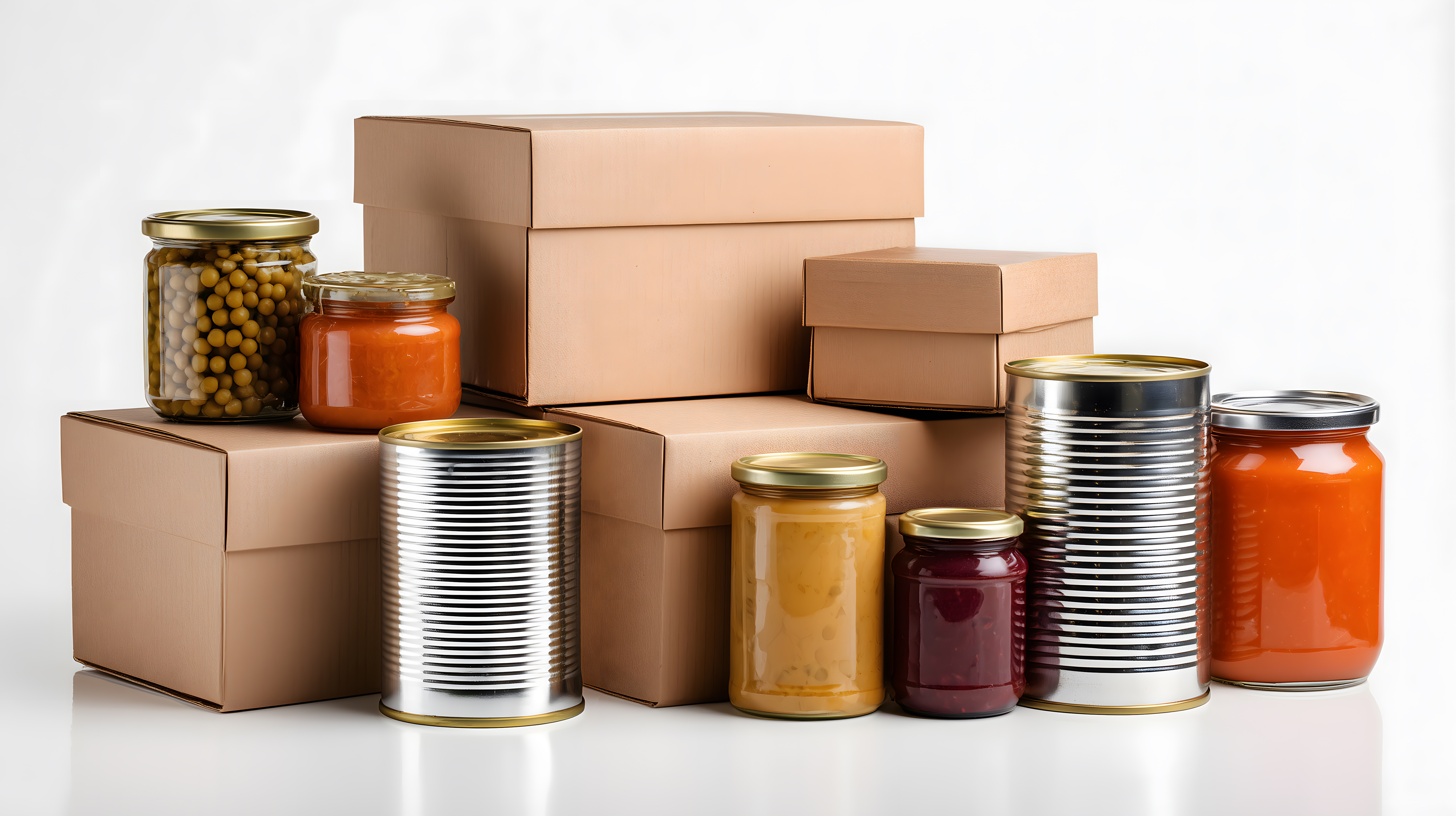 Dieses Stockfoto zeigt eine Vielzahl verschiedener Lebensmittelkonserven und Einmachgläser auf weißem Hintergrund. Die Konserven und Gläser sind in Kartons und direkt auf der Oberfläche angeordnet, sodass eine geordnete, aber vielfältige Komposition entsteht. Zu sehen sind Konserven mit Tomatenketchup, Marmelade, Gewürzen und anderen haltbaren Lebensmittelprodukten. Das Foto eignet sich hervorragend für den Einsatz in Blogs, Social-Media-Beiträgen, Newslettern oder Werbekampagnen rund um das Thema Kochen, Ernährung und Haushaltsorganisation. Das hochauflösende Bild ist kostenlos als Stockfoto unter einer Creative-Commons-Lizenz verfügbar.