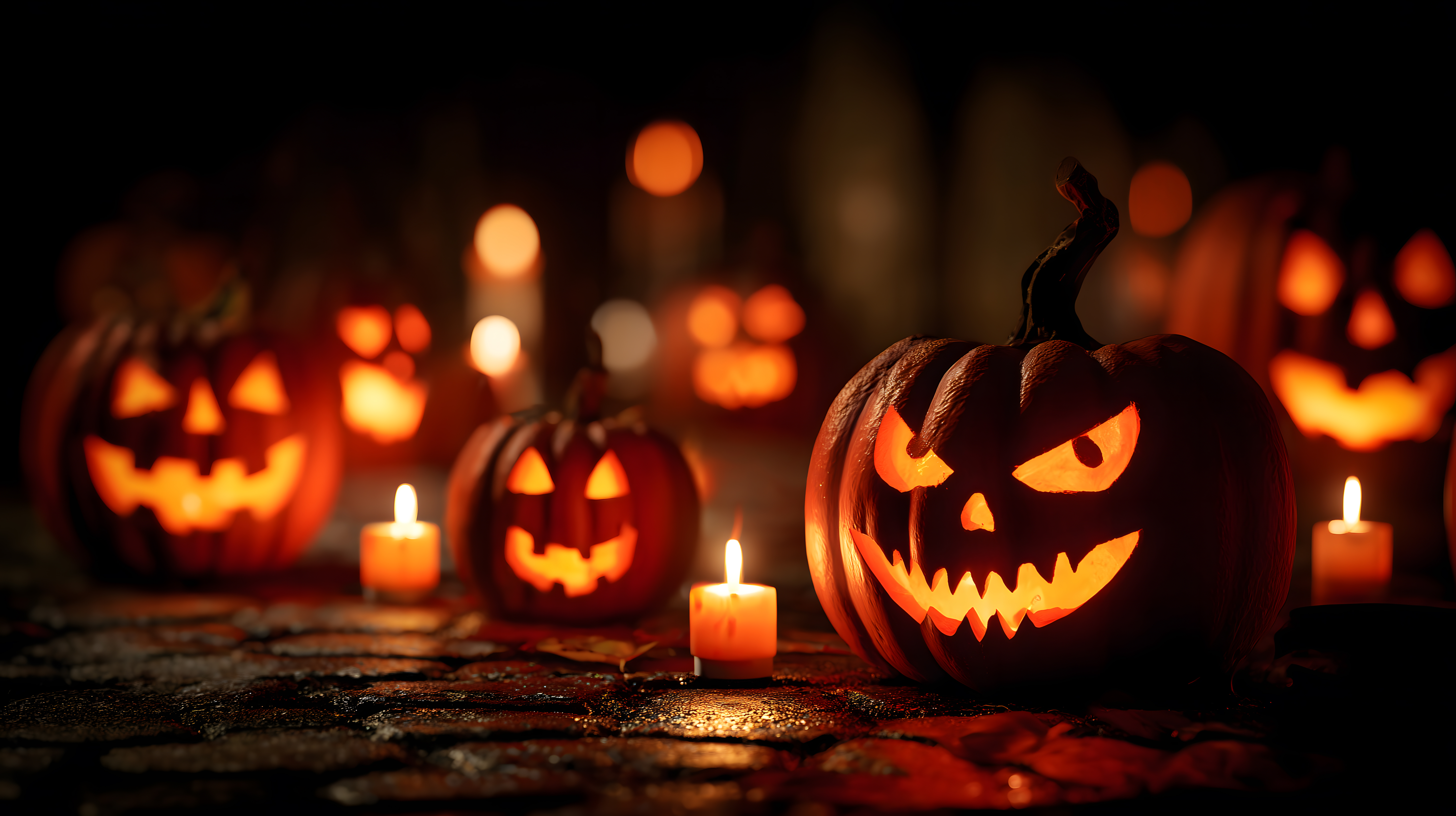 Dieses düstere Foto zeigt eine Gruppe beängstigend leuchtender Halloween-Kürbisse mit grimmigen Gesichtern, umgeben von flackernden Kerzen auf einer dunklen, holzigen Oberfläche. Die stimmungsvolle Beleuchtung und das mystische Ambiente schaffen eine unheimliche, faszinierende Atmosphäre, die perfekt für Horrorthemen, Halloween-Dekorationen oder herbstliche Stimmungsbilder geeignet ist. Als hochauflösendes, kostenloses Stockfoto unter Creative-Commons-Lizenz kann es vielfältig in Blogs, Social-Media-Posts, Newslettern oder Werbematerialien eingesetzt werden.