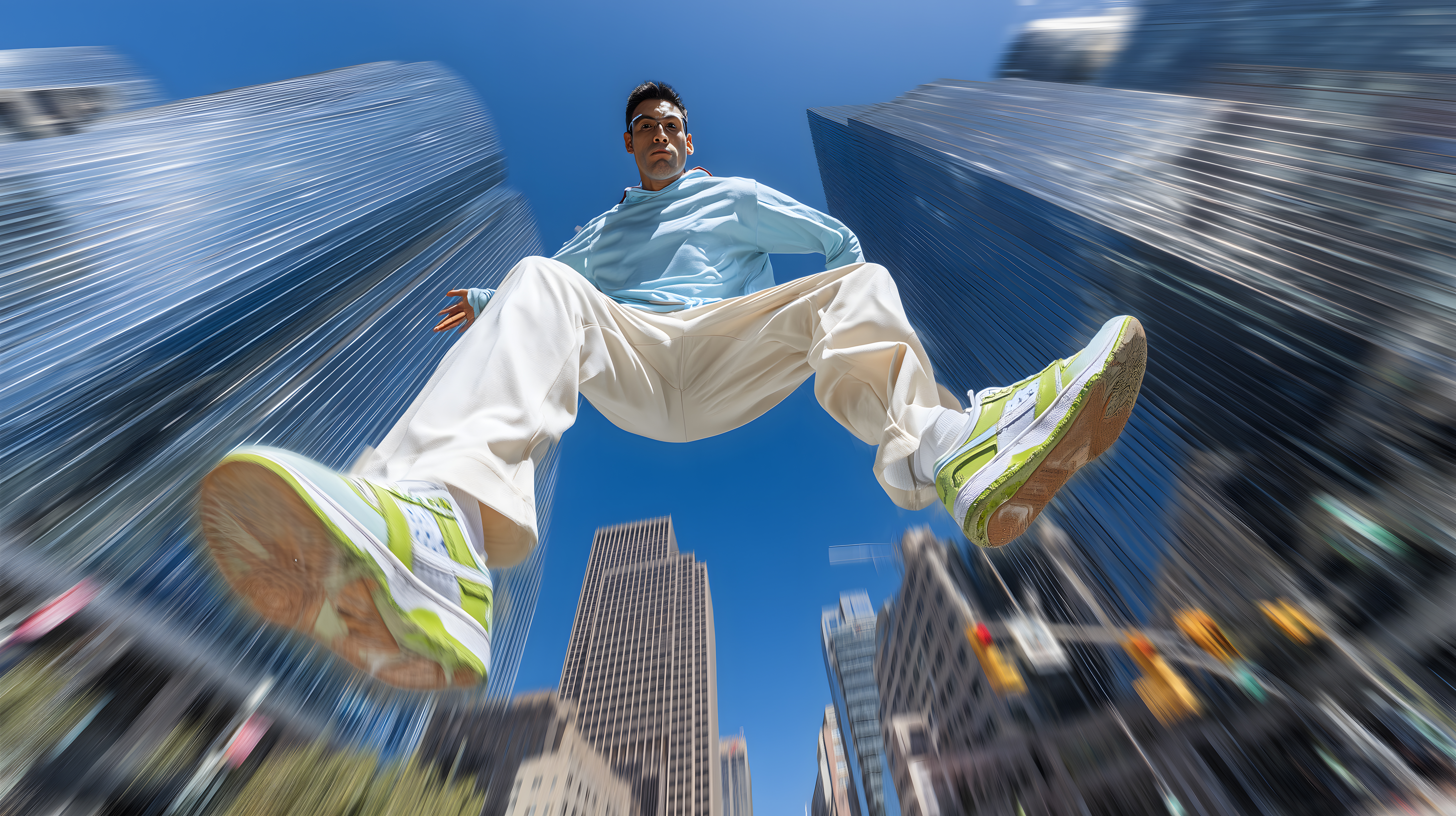 Das Foto zeigt einen dynamischen Mann, der mit Schwung und Agilität zwischen hohen Gebäuden in einer Großstadt springt. Die Perspektive aus der Froschperspektive unterstreicht die Bewegung und Energie der Szene, während die verschwommenen Hintergründe und der klare Himmel den Fokus auf den Sprung des Mannes lenken. Das Bild vermittelt ein Gefühl von Freiheit, Mut und Überwindung von Grenzen. Es eignet sich hervorragend für den Einsatz in Konzepten zu Themen wie Fitness, Stadtleben, Herausforderung oder Erfolg. Als hochwertiges, kostenloses Stockfoto unter einer Creative-Commons-Lizenz kann es vielfältig in Blogs, Social-Media-Kanälen oder Werbekampagnen verwendet werden.