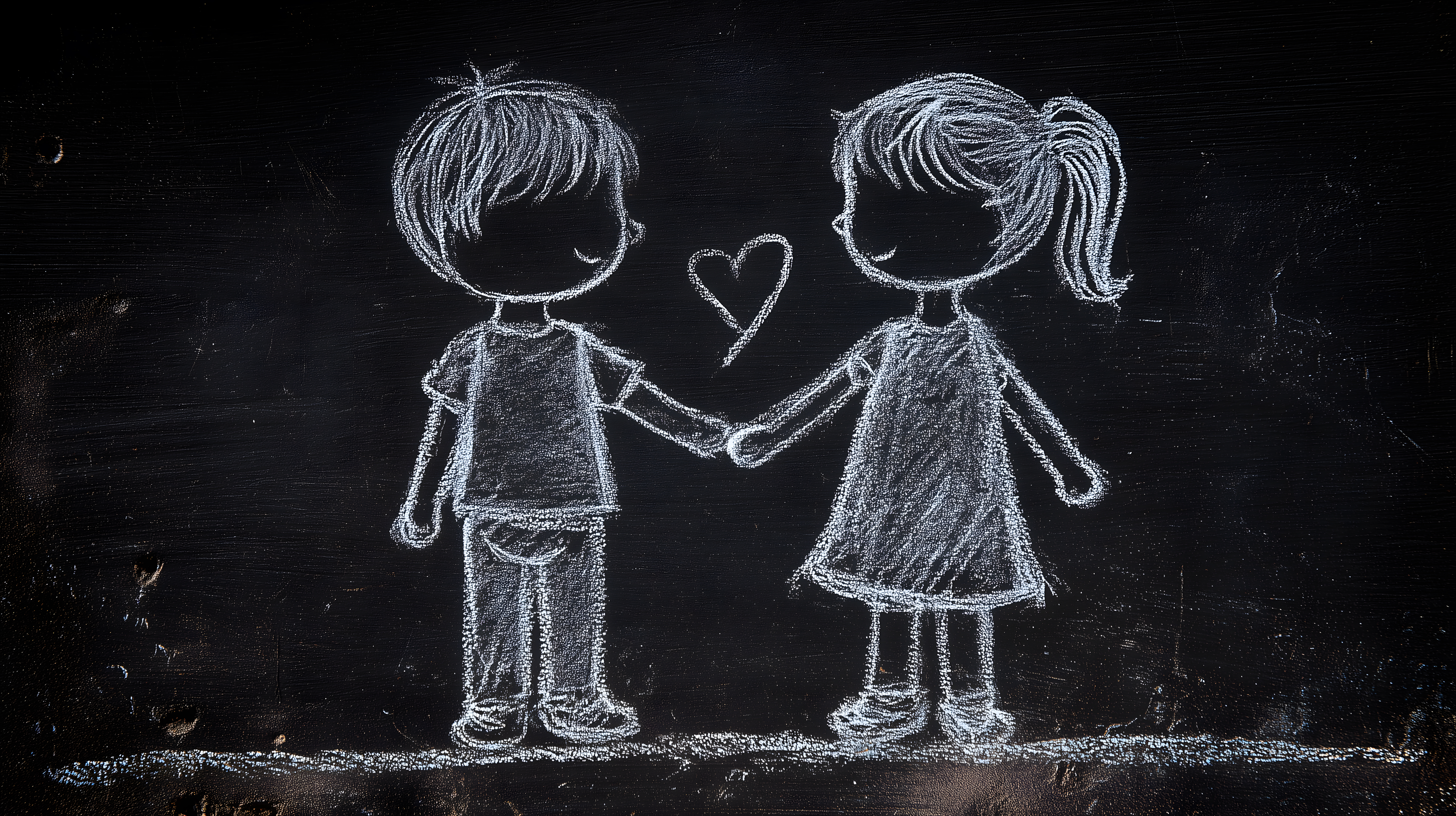 This black and white chalk drawing depicts two children, a boy and a girl, holding hands and sharing a heart symbol between them. The simple, minimalist style and the use of chalk on a dark background give the image a charming, nostalgic feel. This free stock photo would be suitable for a variety of uses, such as blog posts, social media content, educational materials, or wall art. The high-resolution image is available under a Creative Commons license, allowing for easy and versatile integration into various projects.