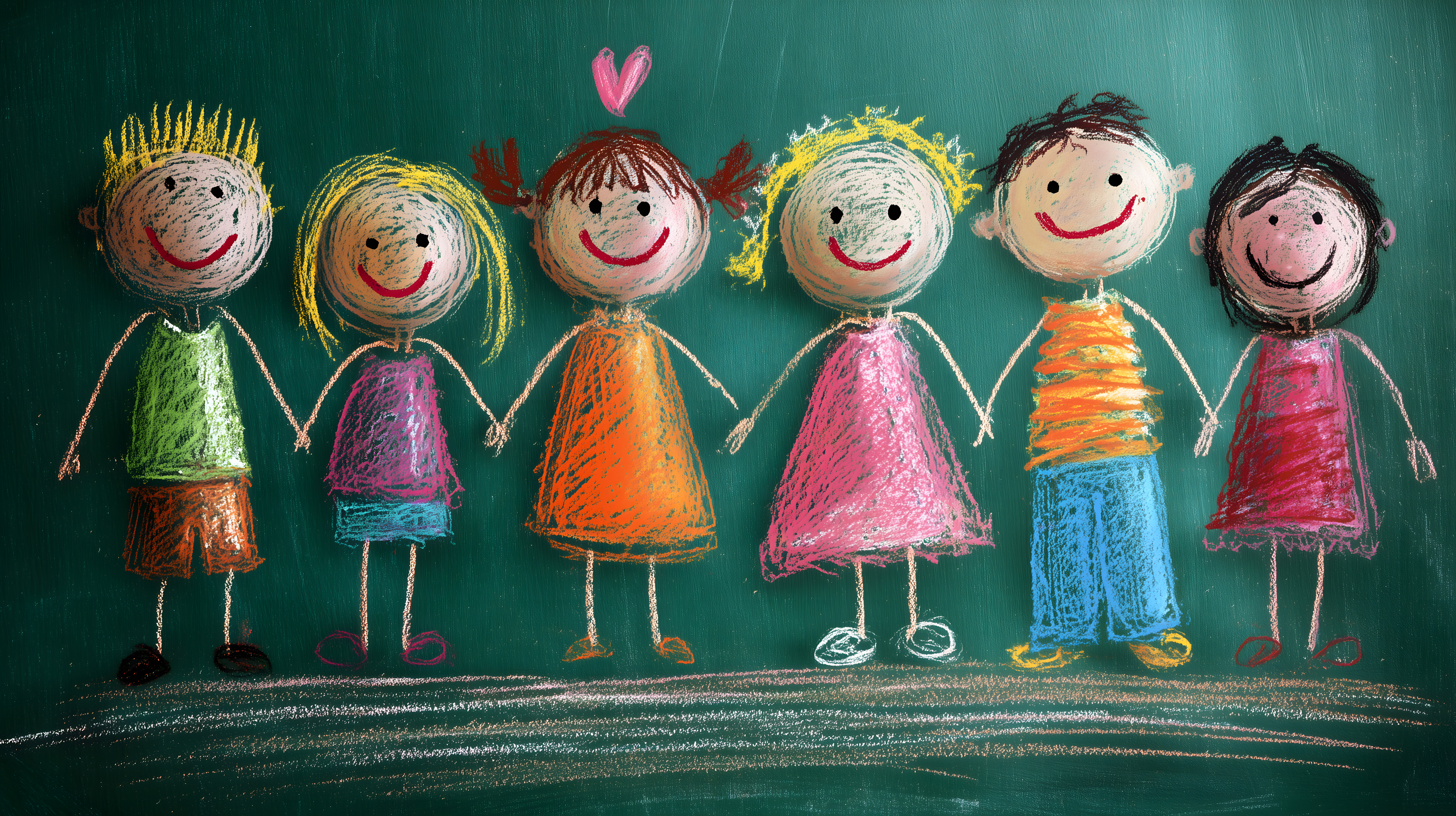 Die Kreidezeichnung zeigt eine Gruppe fröhlicher Kinderfiguren auf einer grünen Tafel. Die Figuren sind mit bunter Kreide gemalt und haben strahlende, lächelnde Gesichter. Sie tragen verschiedenfarbige Kleidung und haben unterschiedliche Frisuren, wie Zöpfe oder Locken. Die Komposition ist symmetrisch und dynamisch, die Kinder stehen nebeneinander und vermitteln ein Gefühl von Lebendigkeit und Zusammenhalt. Dieses kostenlose Stockfoto in hoher Auflösung eignet sich hervorragend für den Einsatz in Blogs, Newslettern, Social-Media-Kanälen oder Werbematerialien rund um die Themen Kindheit, Schule, Kreativität und Bildung. Die Illustration ist unter einer Creative-Commons-Lizenz verfügbar.