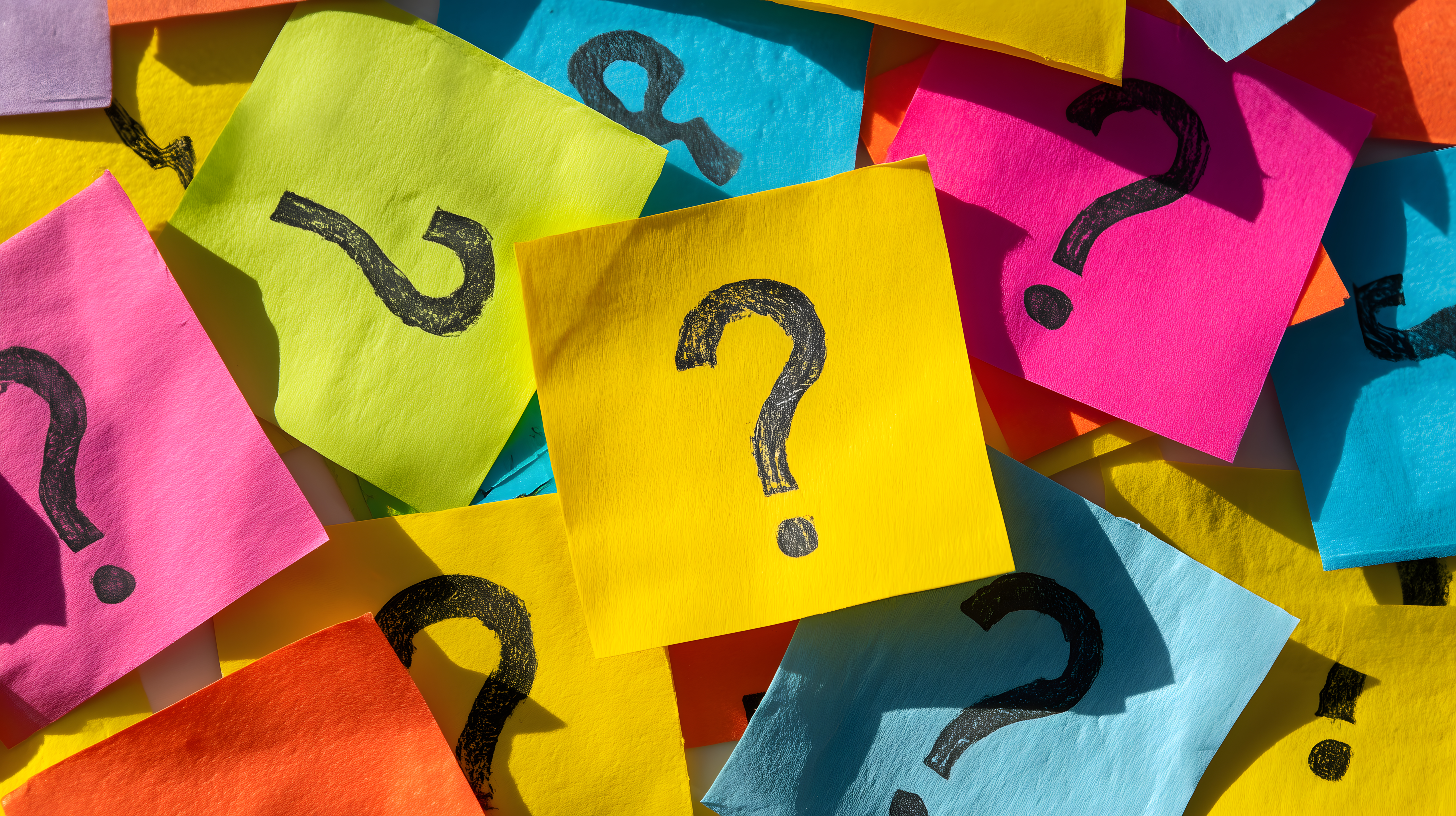 Dieses farbenfroh gestaltete Foto zeigt eine Ansammlung bunter Haftnotizen, auf denen große Fragezeichen abgebildet sind. Die Notizen in unterschiedlichen Neonfarben wie Gelb, Pink und Blau sind lose auf einer Oberfläche drapiert und erzeugen ein dynamisches, inspirierendes Bild. Die Anordnung der Notizen lässt den Betrachter Fragen, Rätsel und Ungewissheit assoziieren, die zum kreativen Brainstorming und zur Problemlösung anregen können. Dieses kostenlose Stockfoto in hoher Auflösung kann ideal für Blogs, Social-Media-Posts, Newsletter oder Werbematerial verwendet werden, um Themen wie Kreativität, Innovation oder unternehmerisches Denken visuell zu unterstreichen.
