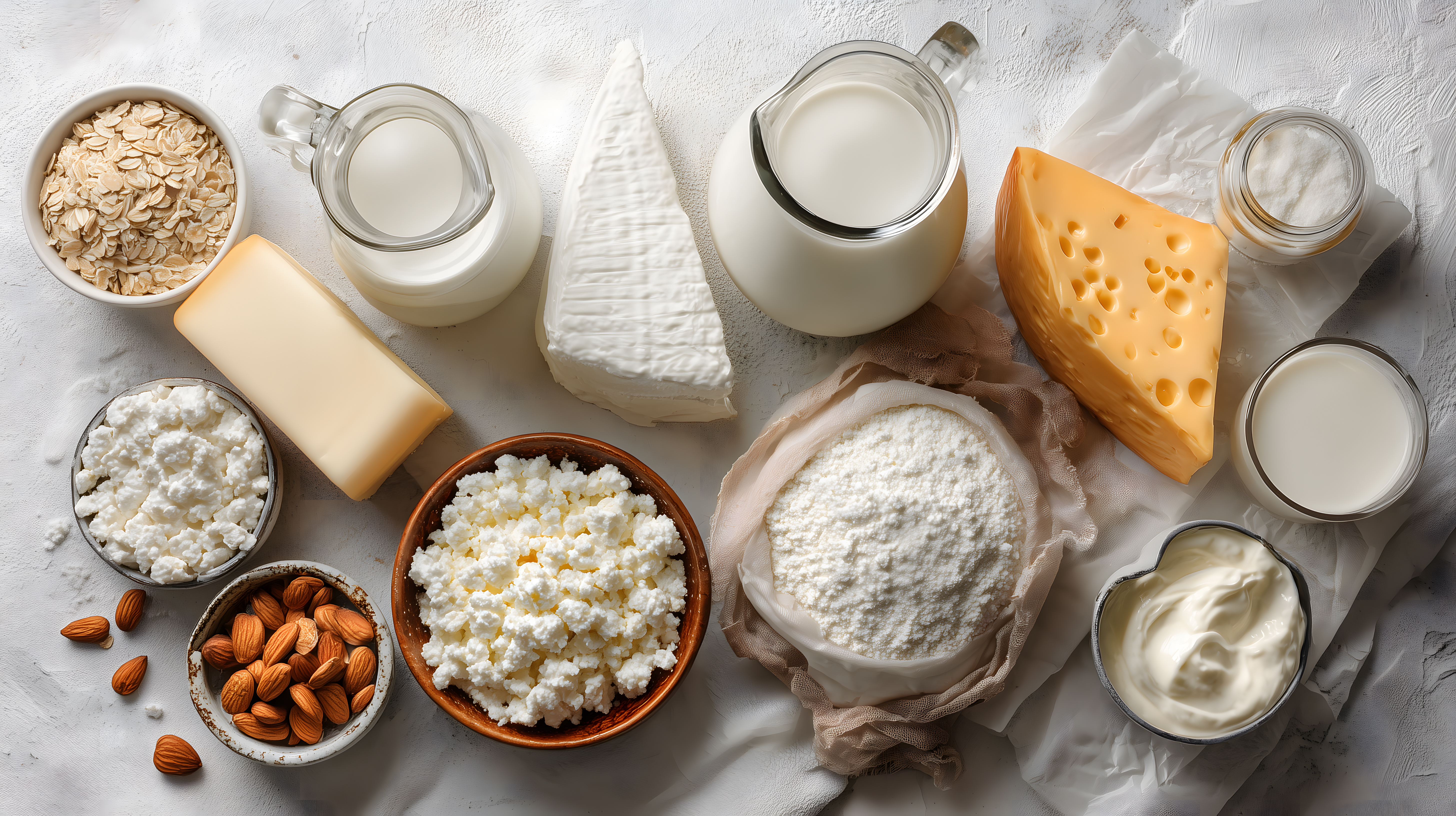 Dieses Foto zeigt eine Auswahl an Milchprodukten und Käse in einem stilvollen Flatlay-Arrangement auf einem hellen, marmorartigen Hintergrund. Die Szene beinhaltet verschiedene Käsesorten, Quark, Milch in Glasflaschen, Haferflocken, Mandeln und weitere laktosehaltige Lebensmittel. Die Anordnung und das natürliche Licht schaffen eine appetitliche und gemütliche Atmosphäre, die ideal für Rezepte, Kochbücher, Blogbeiträge oder Werbung für gesunde Ernährung geeignet ist. Dieses hochwertige, kostenlose Stockfoto ist in hoher Auflösung und unter der Creative-Commons-Lizenz verfügbar.