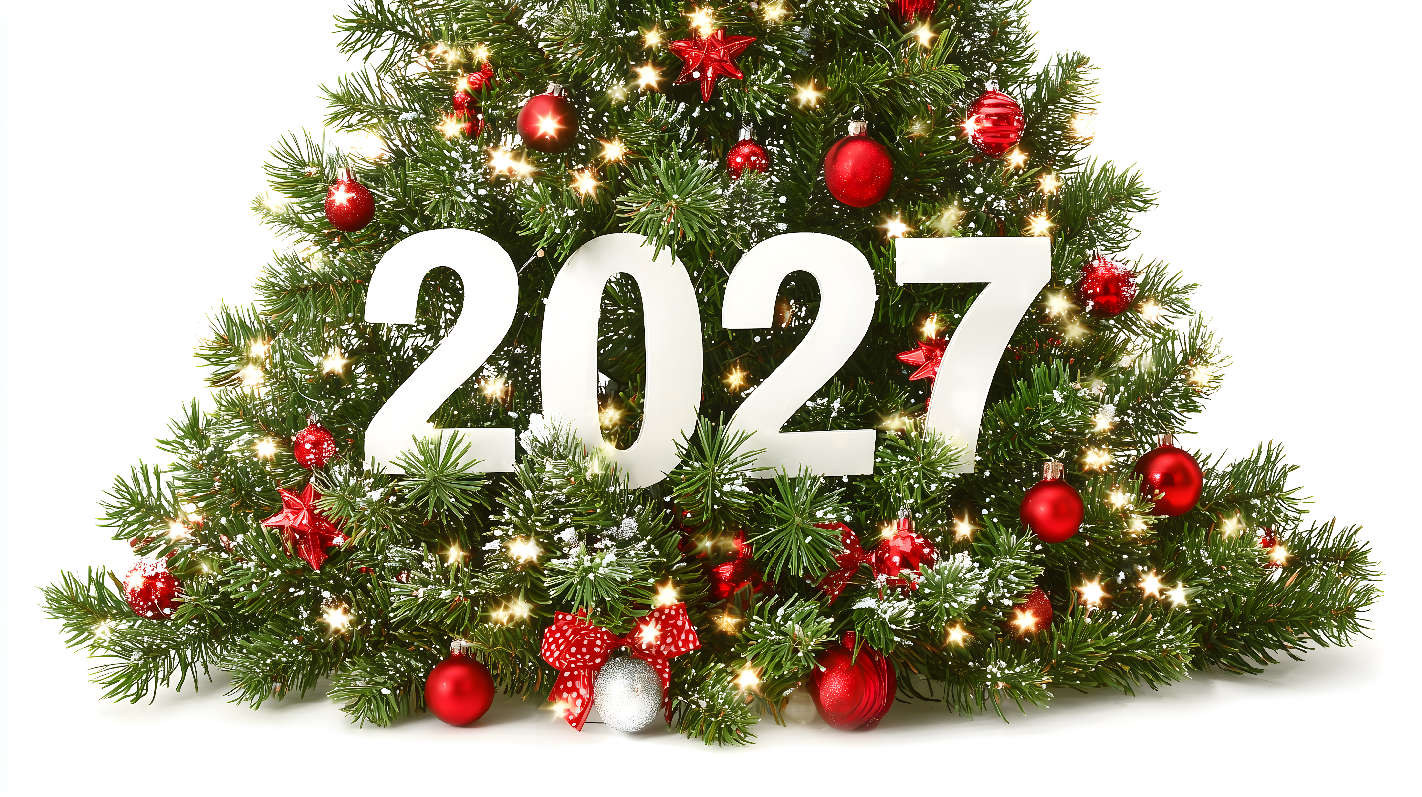 Das Bild zeigt einen prächtigen Weihnachtsbaum, geschmückt mit funkelnden roten Christbaumkugeln und Sternen. Die großen, weißen Ziffern 2027 dominieren die Mitte des Bildes und kündigen das kommende Jahr an. Der Baum ist von einem Lichterkranz umgeben, der eine warme, festliche Atmosphäre schafft. Das Foto eignet sich hervorragend für Neujahrskarten, Werbematerial rund um den Jahreswechsel oder weihnachtliche Social-Media-Beiträge. Es handelt sich um ein kostenloses Stockfoto in hoher Auflösung, das unter der Creative-Commons-Lizenz verfügbar ist.